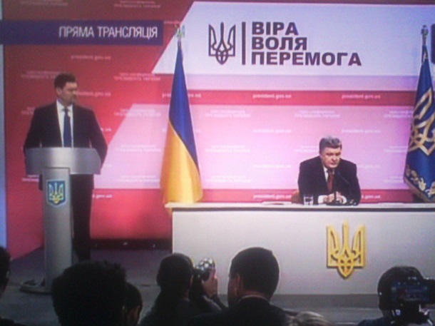 А оце той рожевий фон, про який казала Ганапольському бабуся, за що наразилася на бан. До речі, слоган прес-конференції Петра Порошенка: "ВІРА ВОЛЯ ПЕРЕМОГА". Скорочено ВВП. Досі ця загальновідома абревіатура, окрім "валового внутрішнього продукту", означала куди більш поширене - "владімір владіміровіч путін". То це звичайне співпадіння чи спеціально зашифроване послання змістів персонально ху#лу? В смислі альтернативи трактування ВВП, яке тепер здобуло українського наповнення й звучання.