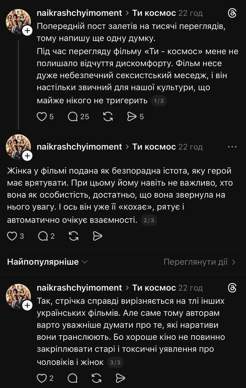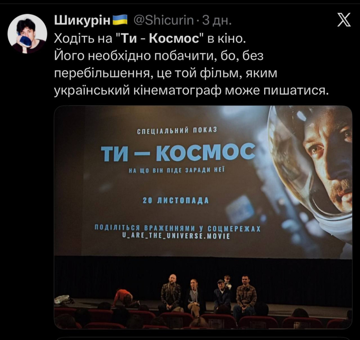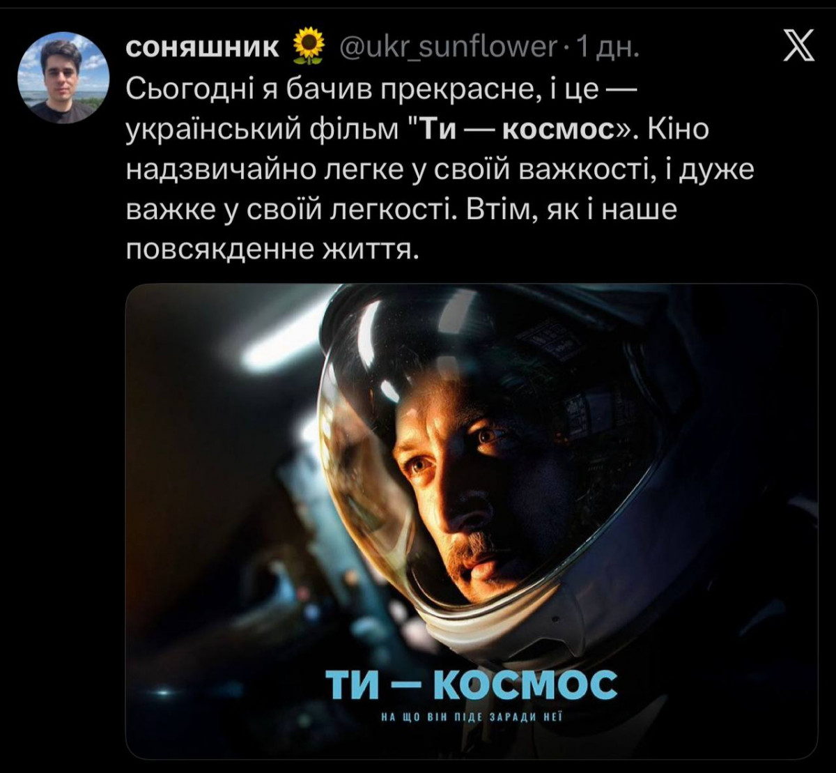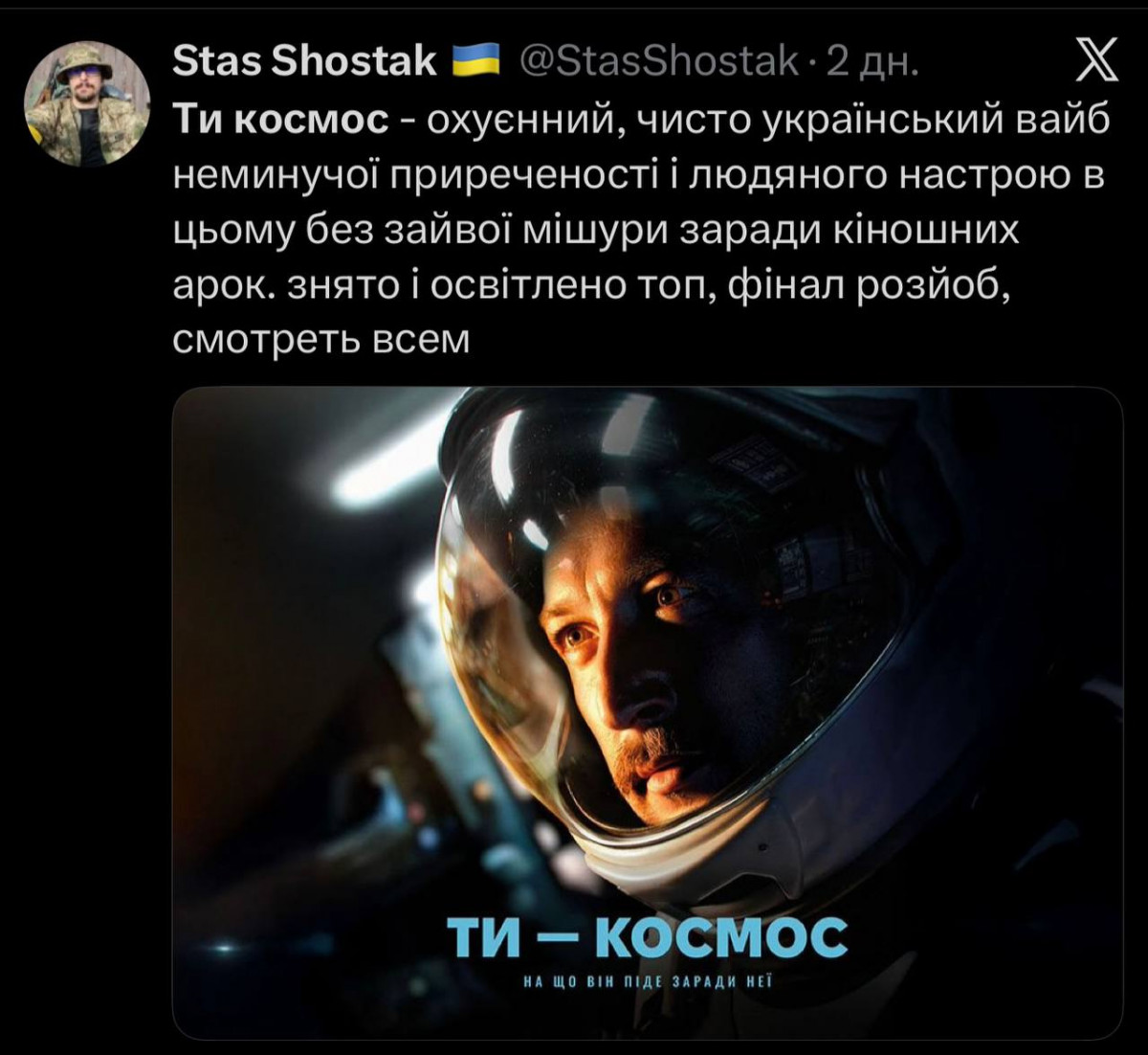 Так, у нас вже є багато фільмів у форматі «я його хвалю не тому, що треба підтримувати українське, а тому, що воно мені сподобалося». Але цього все ще мало, аби позбавити нас психологічної травми, колись завданої «Штольнею» та ще кількома «шедеврами—. У цьому контексті справді дуже майстерно зроблений «Ти – космос» справив не просто позитивний, а цілий вау-ефект.