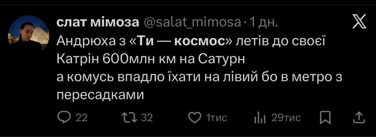 А особисто мені хочеться бачити «Ти — космос» у топі найкасовіших українських стрічок ще й тому, щоб частина наших продюсерів збагнула, що глядачі підуть не лише на дурноверхе кіно, але й на розумне. І їм потрібно це пропонувати трохи частіше.