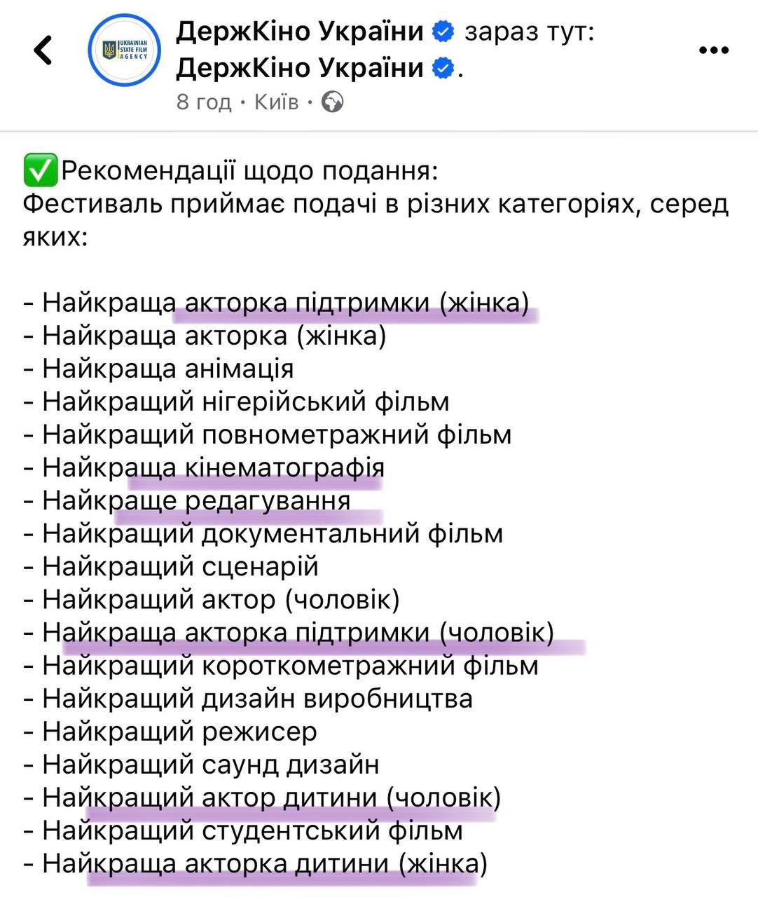 Загалом кіноакадеміки нині оголосили короткі списки у таких категоріях: «Найкращий актор дитини», «Накраща акторка підтримки», «Найкраще редагування»... Ой, всьо. Не могла стриматися, даруйте. Це такий тяжкий гумор української кіноспільноти – колись Держкіно було навчилося користуватися гуглтранслейтом, але до кінця не опанувало ці технолоджі. Ось тут почитайте, аби розуміти, що означає мем «повний Ібадан». А ось підказка.