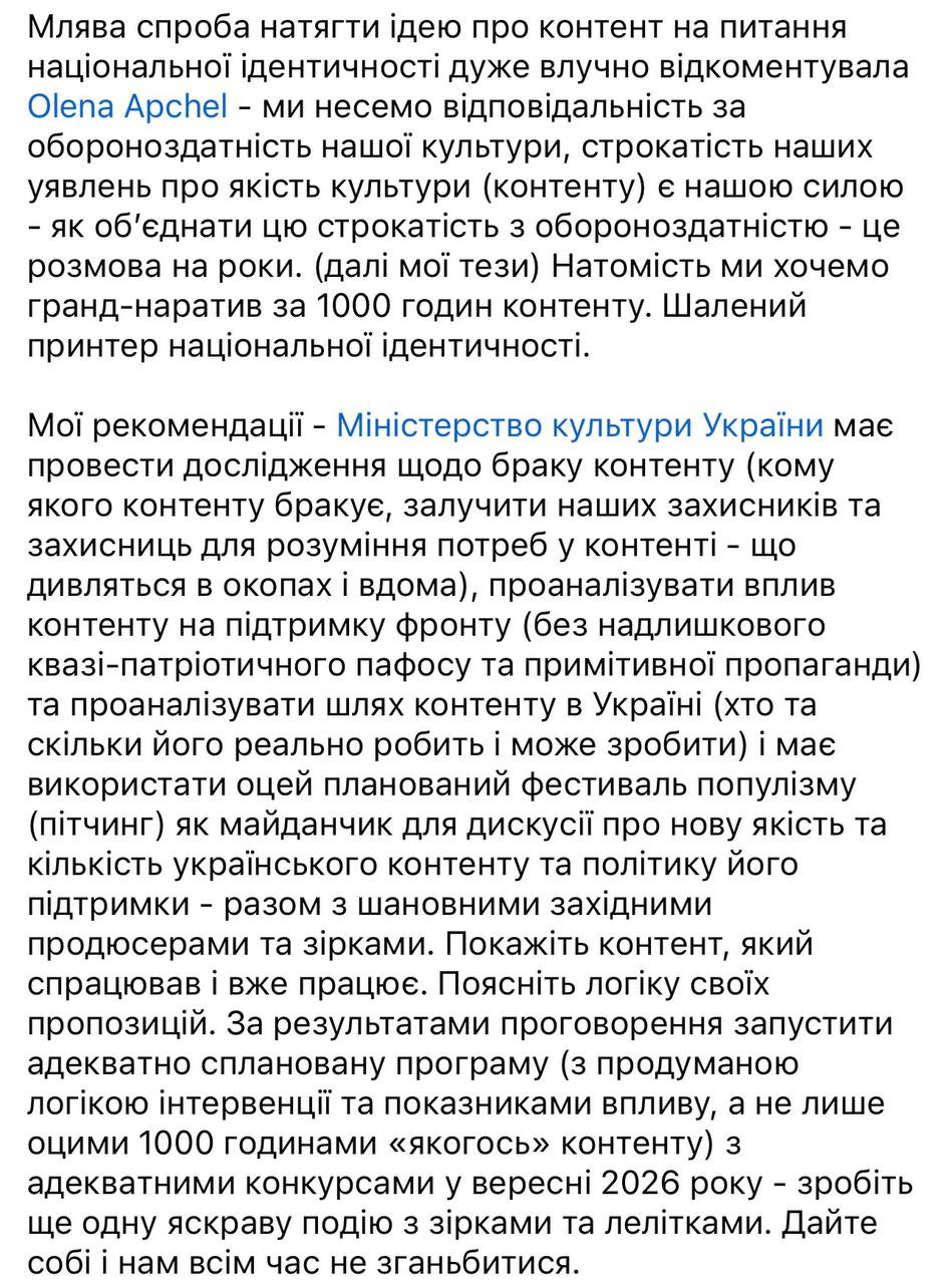 Хочеться нагадати, що різні конкурси в Держкіно, УКФ, Мінкульті тривають роками, маємо вже більш ніж тисячу годин контенту. Чому тоді цей гранднаратив досі не сформувався? Усе це про ідентичність і заміщення російського контенту проговорено незліченну кількість разів. Що було не так досі? І що буде так зараз?