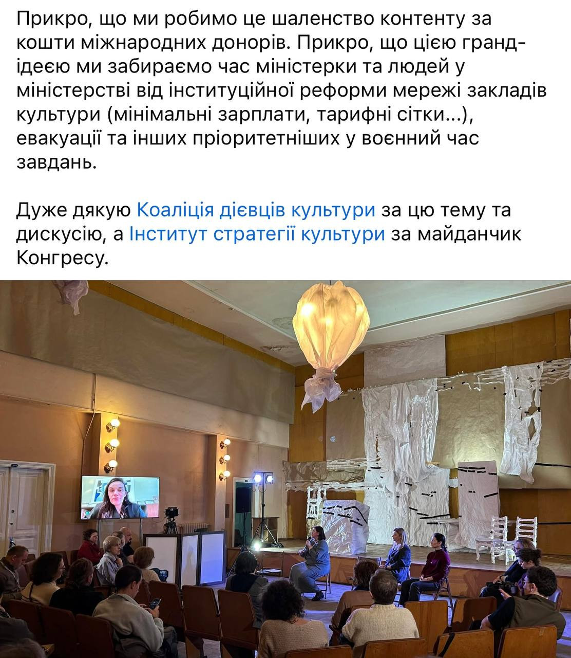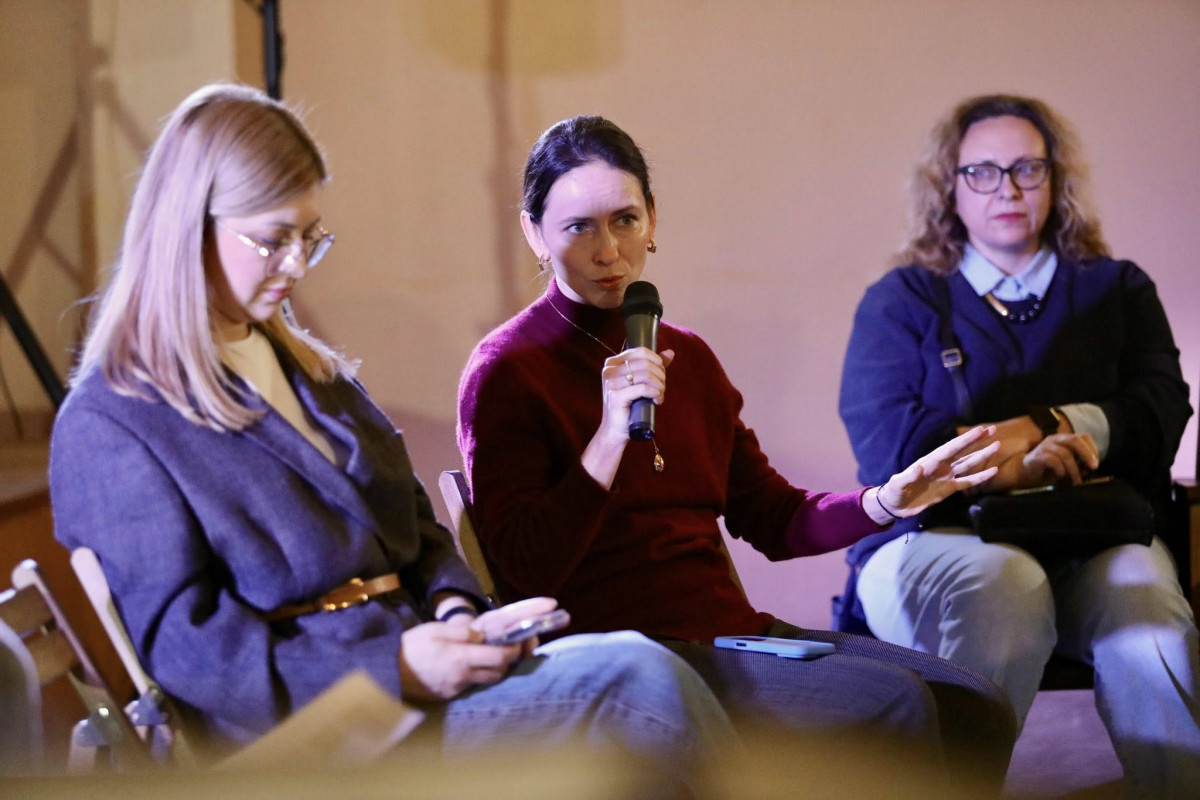 Запросили міністерку культури Тетяну Бережну, менеджерку проєктів Вероніку Селегу (одна з екскандидаток на посаду міністерки культури, між іншим) та виконавчу директорку УКФ Анастасію Образцову. Модерувала розмову моя колега по клубу «Чорний рот» Настя Платонова.