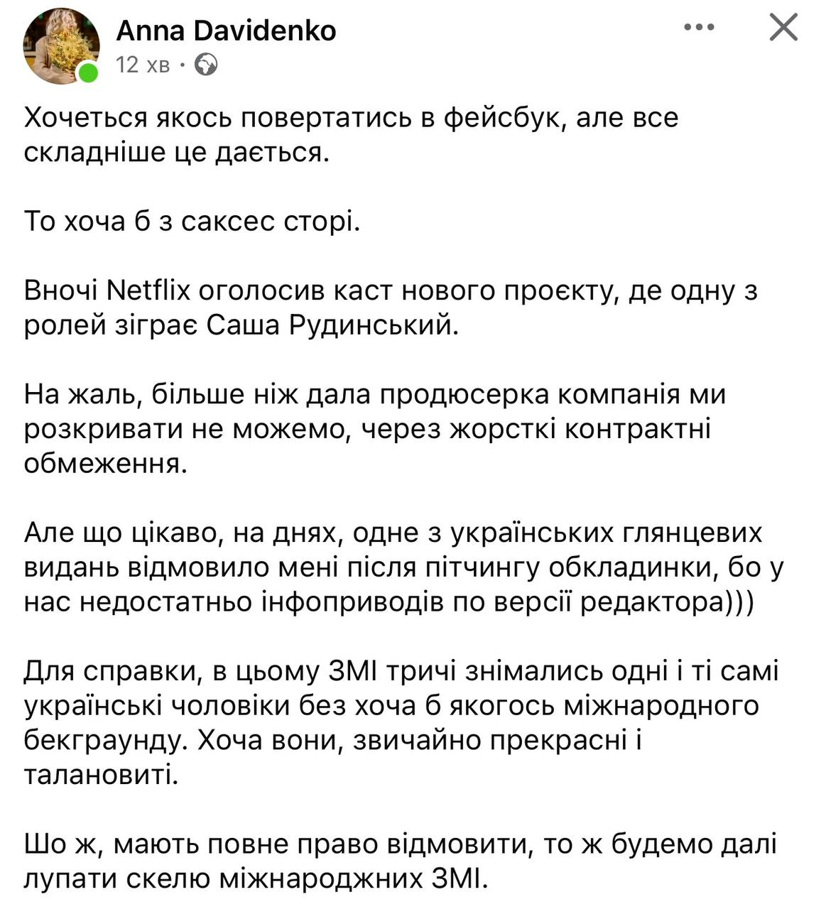 Але без хоч малесенького скандальчику я вас не збираюся лишати. Піарниця Рудинського Анна Давиденко опублікувала допис, у якому серед іншого повідомила, що недавно отримала відмову в обкладинці від одного з наших глянців. За версією редактора — недостатній інфопривід.
