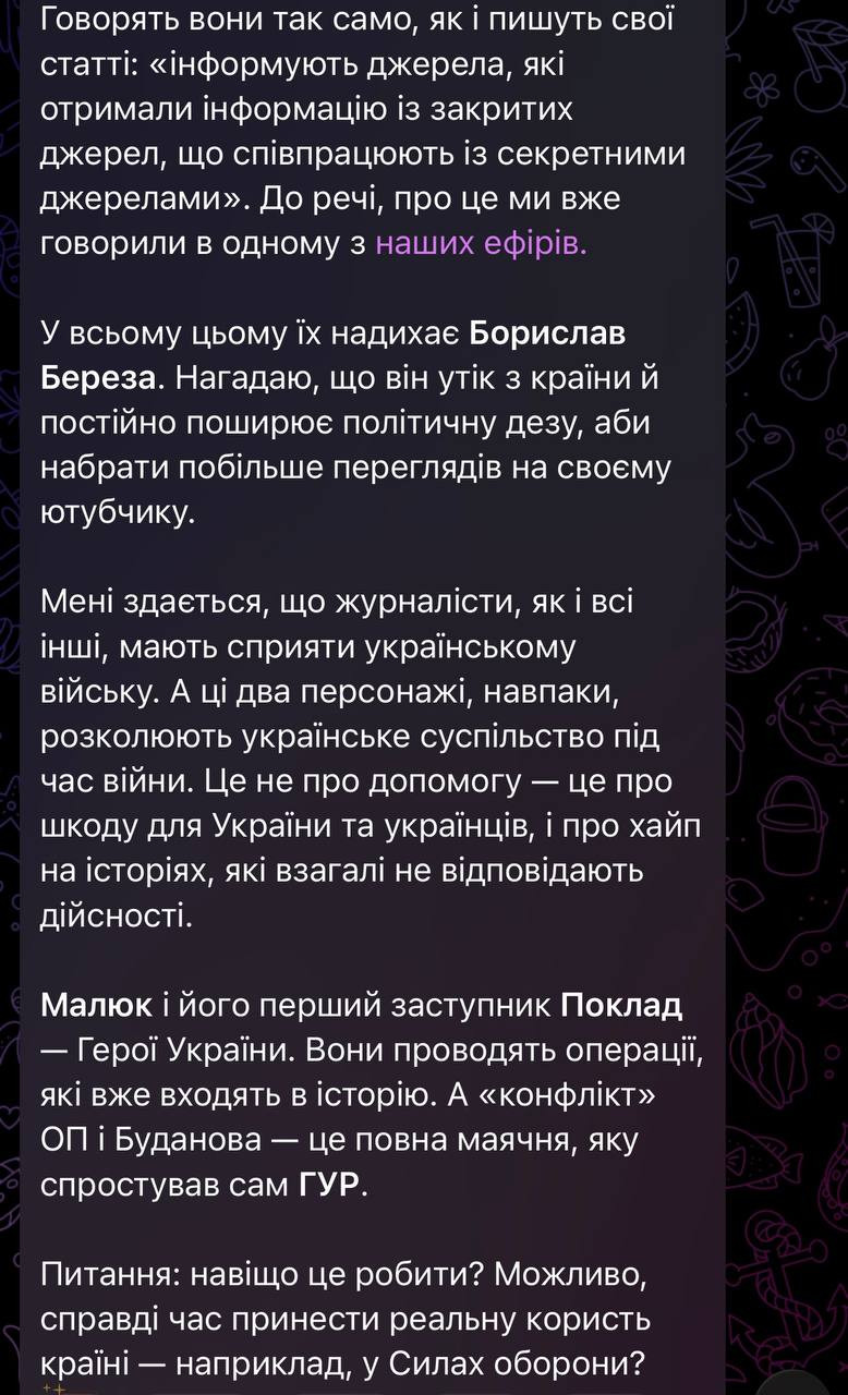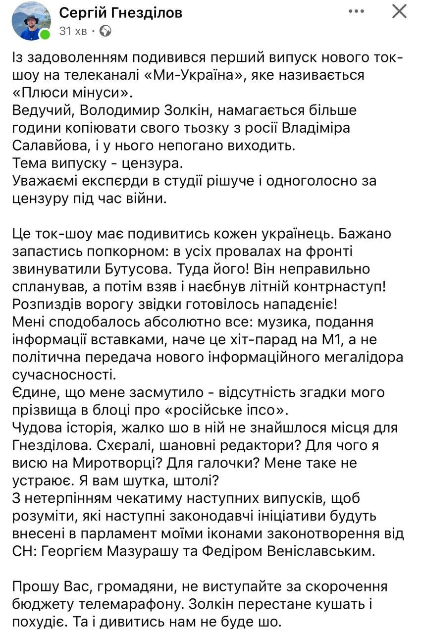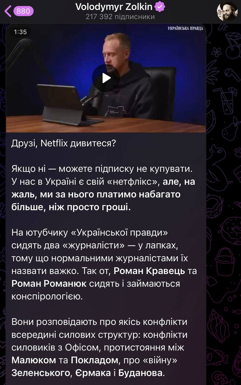 Що ж до нового проєкту Золкіна, тут одразу почався ґвалт із подвійною силою. Бо ті самі чорнороті брехуни також пов’язують цього блогера з Єрмаком (апелюючи, наприклад, до наповнення його телеграм-каналу). Ти дивися на них, всюди того Єрмака треба втулити, — відчепіться вже від людини. Мовляв, кажуть, знаємо ми, що буде в цьому шоу — знову просуватимуть інтереси ОП і готуватимуть населення до виборів.
