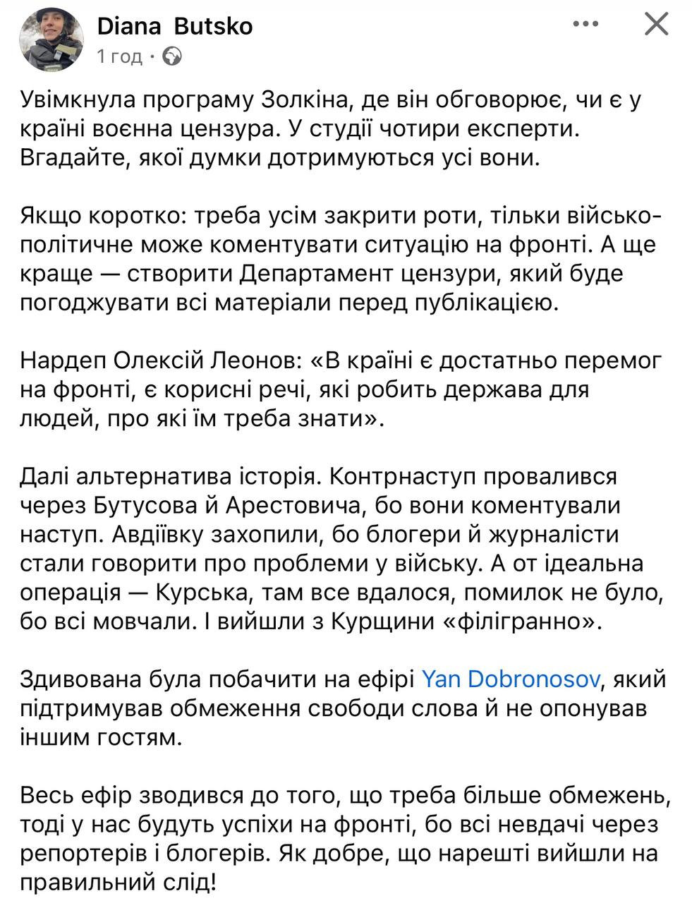 Зараз я вам розповім із прикладами, а поки ось думка воєнної кореспондентки Діани Буцко, бо в шоу великою мірою ішлося про воєнну цензуру.