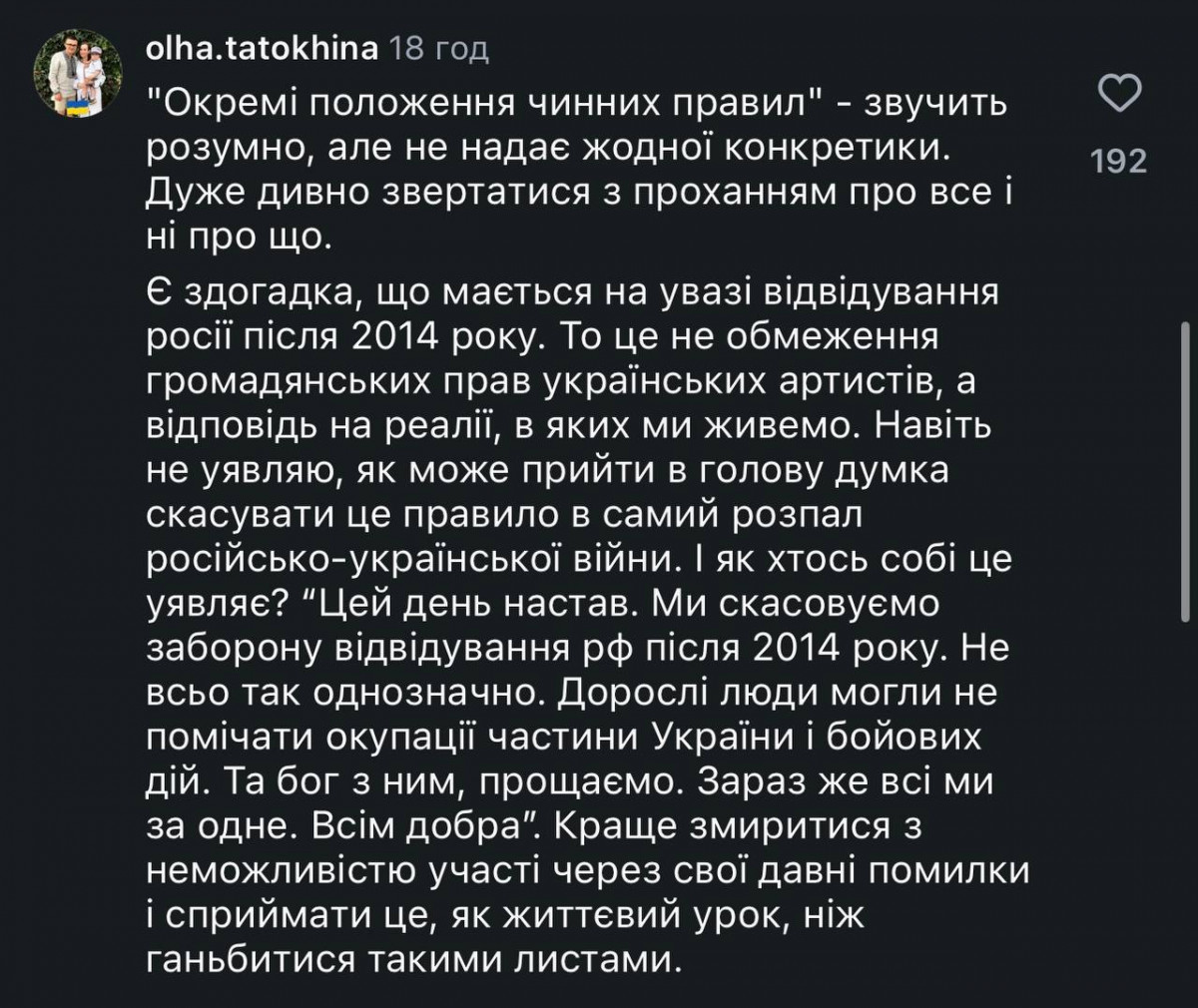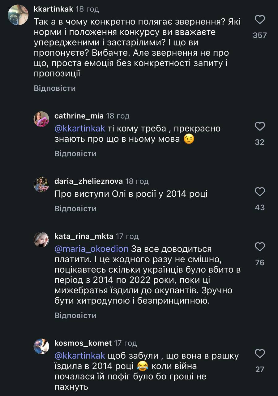 Проте, бачу, з Олею Поляковою та її командою це справа підвищеної складності. У найбільш залайканих коментарях люди пишуть, що це не лист, а вода без жодних пояснень. Що саме мусить змінювати Суспільне у правилах, якщо співачка не пише конкретно, що має на увазі? Хоча, звісно, всі здогадалися, що йдеться про відвідини Росії після початку війни, чим Полякова і відзначилася. Ось тут список правил, розділ 4 «Умови участі у Відборі».