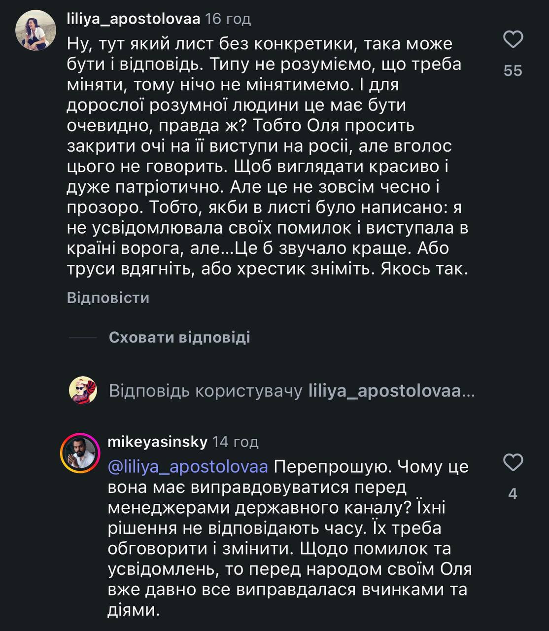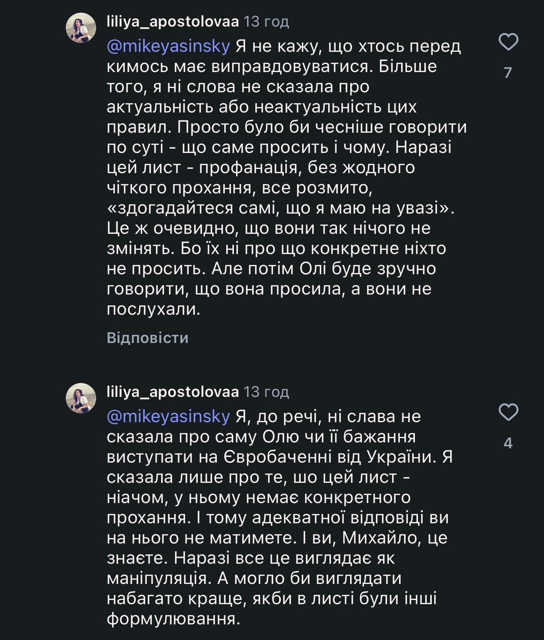 Відповідь когось із команди Полякової я знайшла під коментарем Лілії Апостолової — їй відписався продюсер співачки Михайло Ясинський. І його комент мене вчергове наштовхнув на думку, що цим людям точно потрібно щось робити з кризовою комунікацією, бо ж не перший раз таке.