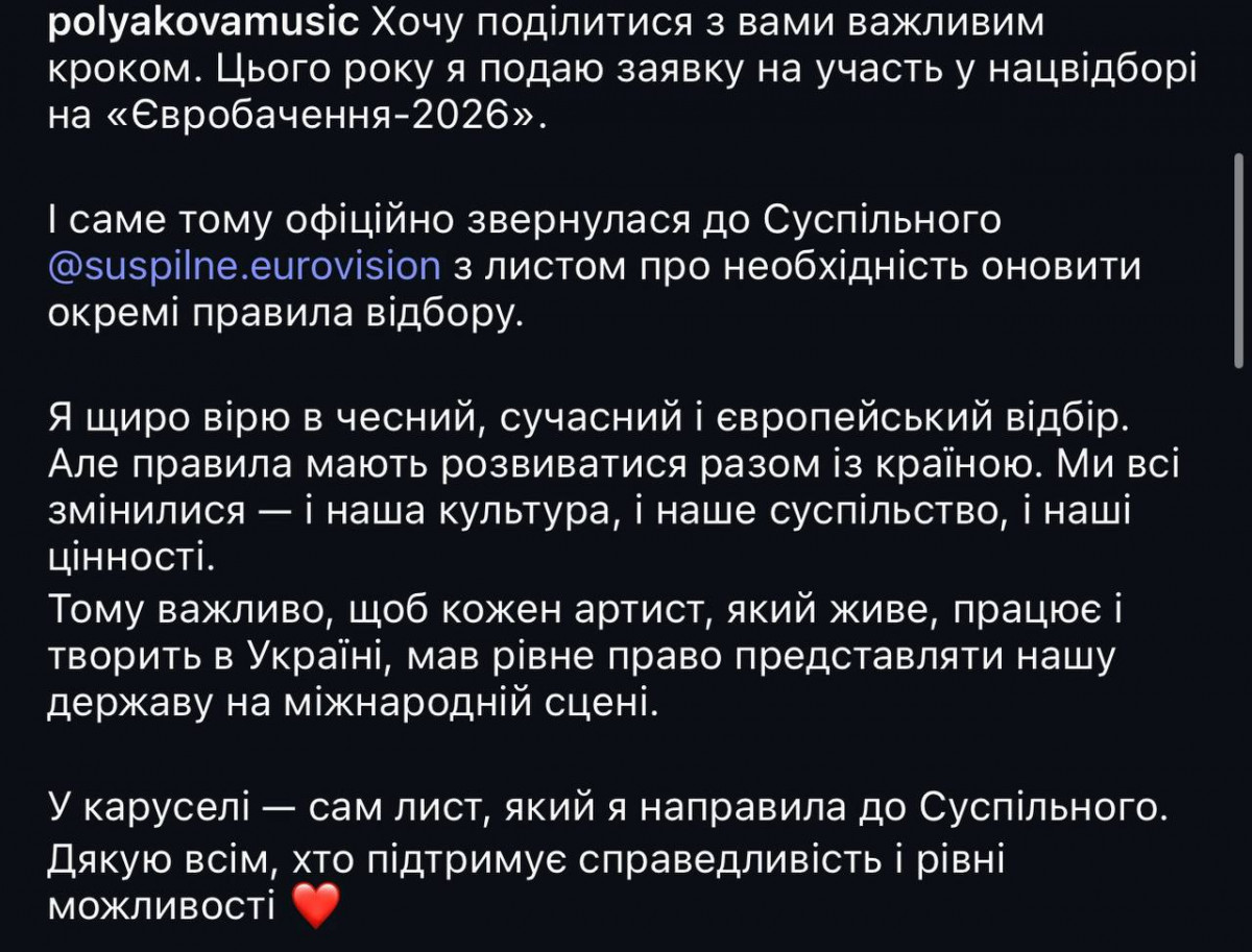 Напередодні в інсті співачки з'являється загадковий допис. У ньому вона оголошує, що цьогоріч подає заявку на участь у нацвідборі на «Євробачення-2026». Але не все так просто, бо для цього потрібно змінити правила. І вона звертається до Суспільного з проханням це зробити. Мовляв, минуло багато часу.