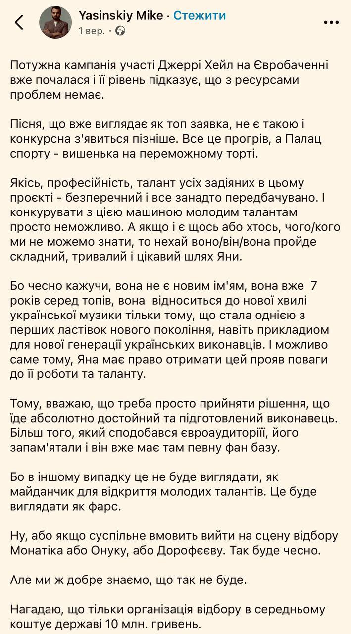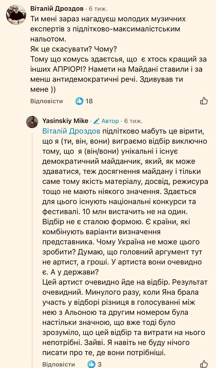 Разом із тим уже згаданий Михайло Ясинський на початку вересня опублікував допис, у якому закликав нацвідбори скасувати взагалі. Щоправда, на користь іншої співачки — Джеррі Хейл: