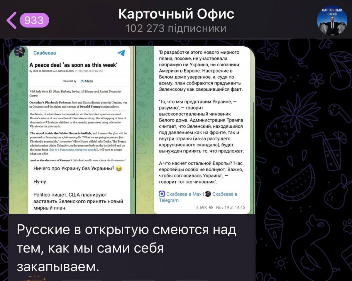Нагадаю, що саме він опублікував на фейсбуку допис-заяву від частини «Слуг народу». У ній ішлося про негайне звільнення фігурантів антикорупційного розслідування, повну підтримку НАБУ і САП, створення коаліції національної стійкості і заклик до єдності в парламенті. З одного боку, на шоу Потураєв твердив, що на зустрічі президент відчував дискомфорт. Але вже потім переконував, що напруги не було, Володимир Зеленський говорив дуже щиро, стримано, і атмосфера була дружня. Однак Осадчук згодом нагадав, що наш президент — хороший актор, якому цілком до снаги зіграти відвертість.