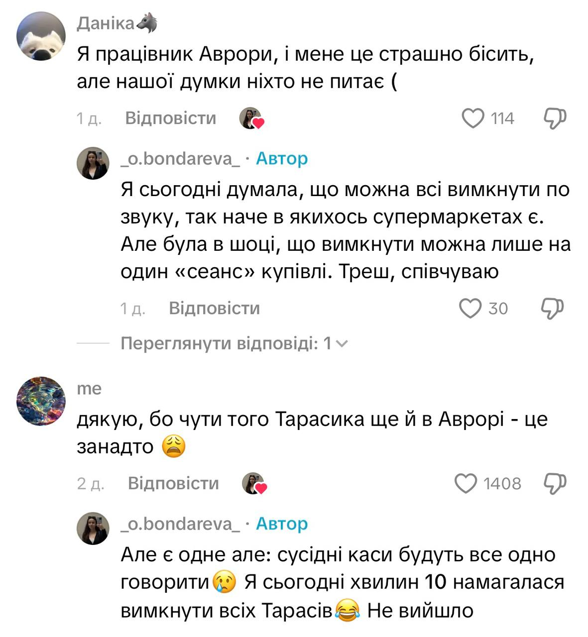 А є ще відео, на якому дівчина показує як вимкнути звук на касі, аби просто купити трішки ганчірочок і прального порошку без зайвих нервів. А якщо серйозно, то загалом бачимо типову реакцію на людину, яка надмірно заполонила собою інформаційний простір, це вже бісить, але ще не на стільки, аби уникати його по-справжньому. Це зараз радше така гра із назвою «О, як дістав цей Тарас, боже поможи».