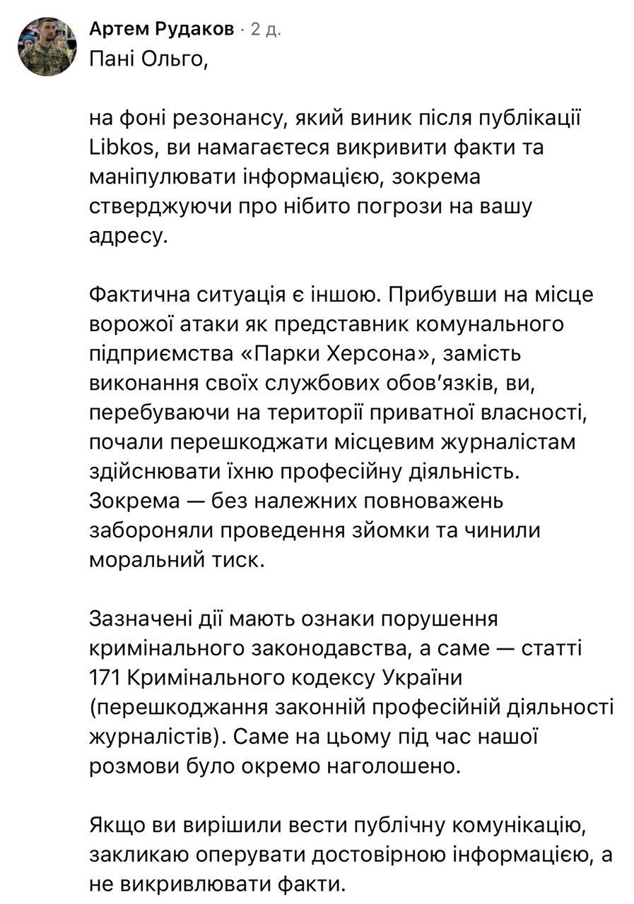 Далі — більше. Працівниця комунального підприємства «Парки Херсона» Ольга Чернишова зробила резонансний допис про те, що Ліберови опублікували фото з нею попри заборону самої зйомки. Все відбувалося у приватному приміщенні після обстрілу. Пані Ольга розповідає, що дізналася про смерть чоловіка в одній із квартир, пішла туди і побачила там його матір. Є інформація, що Ольга Чернишова не лише заспокоювала жінку, але й вирішила зняти з нею інтерв'ю. Але та відреагувала дуже емоційно і зйомка припинилася.