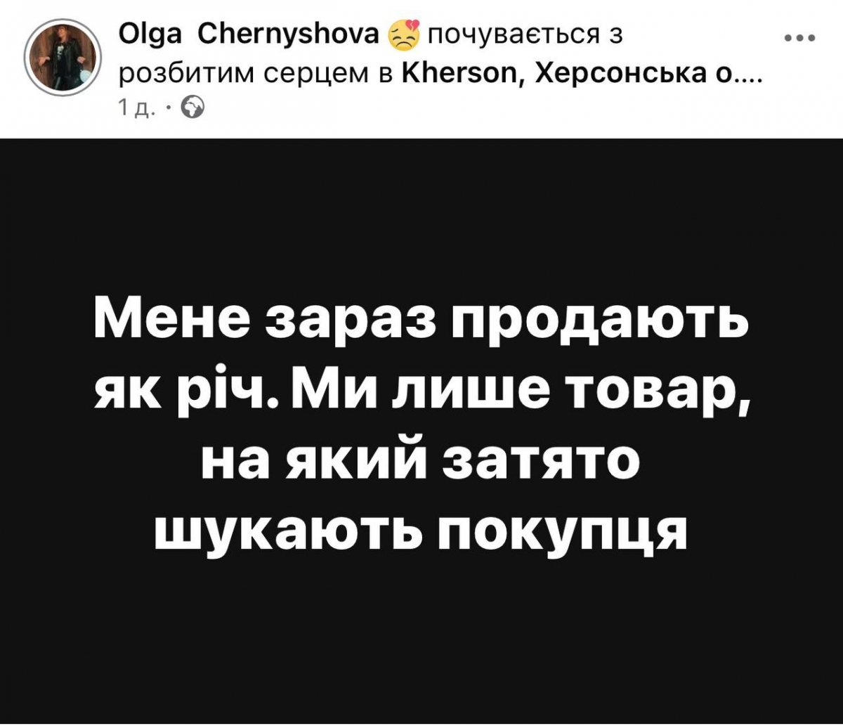 І наостанок. Я поговорила з координаторкою Громадського центру Українського Червоного Хреста в Херсоні Наталією Шатіловою. Представники організації, включно з психологом, приїхали до тієї самої квартири на прохання Ольги Чернишової. Ось що каже пані Наталія: