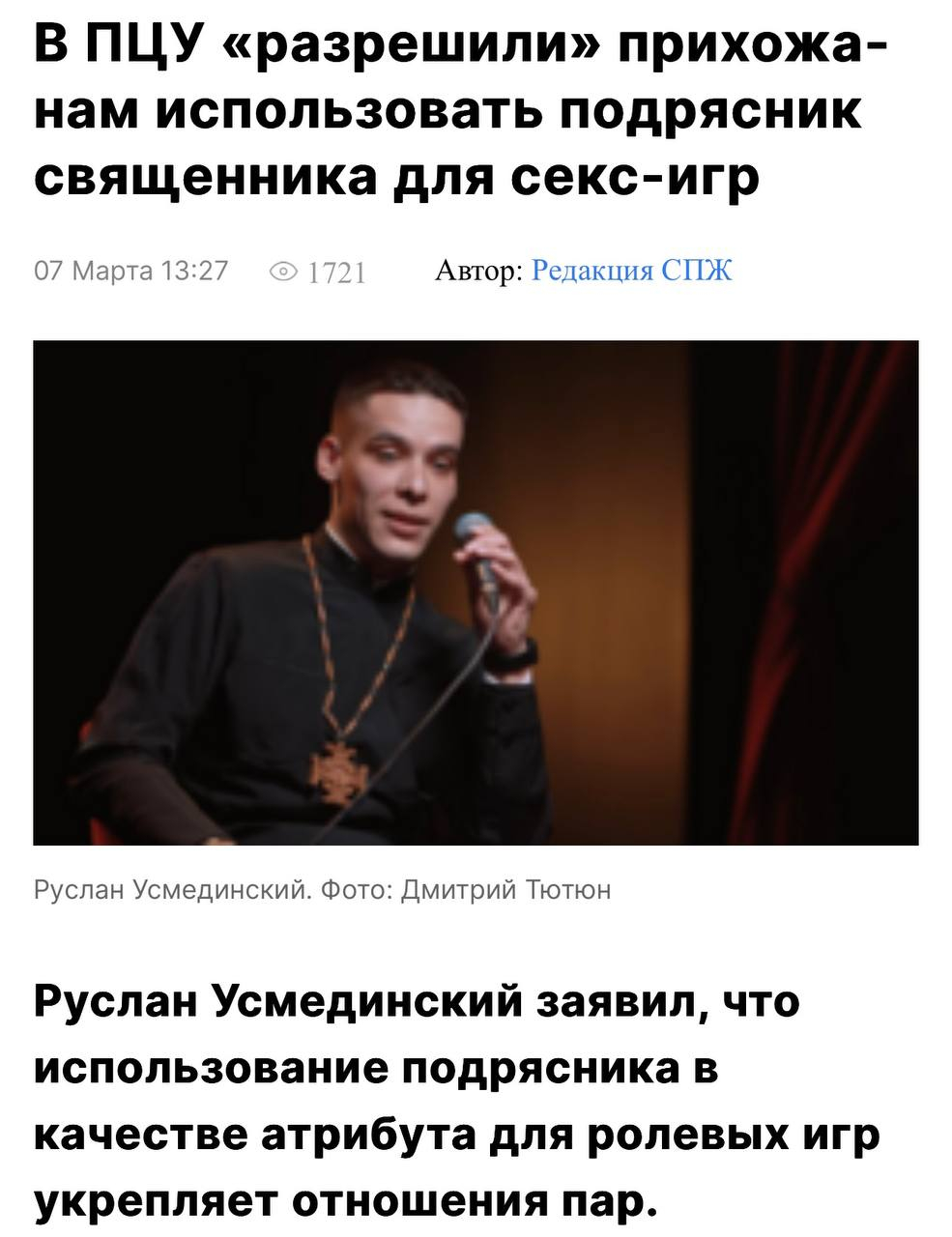 Насправді отець Роман, як на мене, не сказав нічого неприйнятного, хоча й торкнувся досить нестандартної теми. Він розповів, що отримує повідомлення з натяками на інтим. І каже, що в деяких жінок, виявляється, є така фантазія — секс зі священником. Такі пропозиції йому не подобаються, і він напівжартома сказав, що як маєте такий фетиш, то купіть своєму чоловікові підрясник і тіштеся. Ось цей уривок: