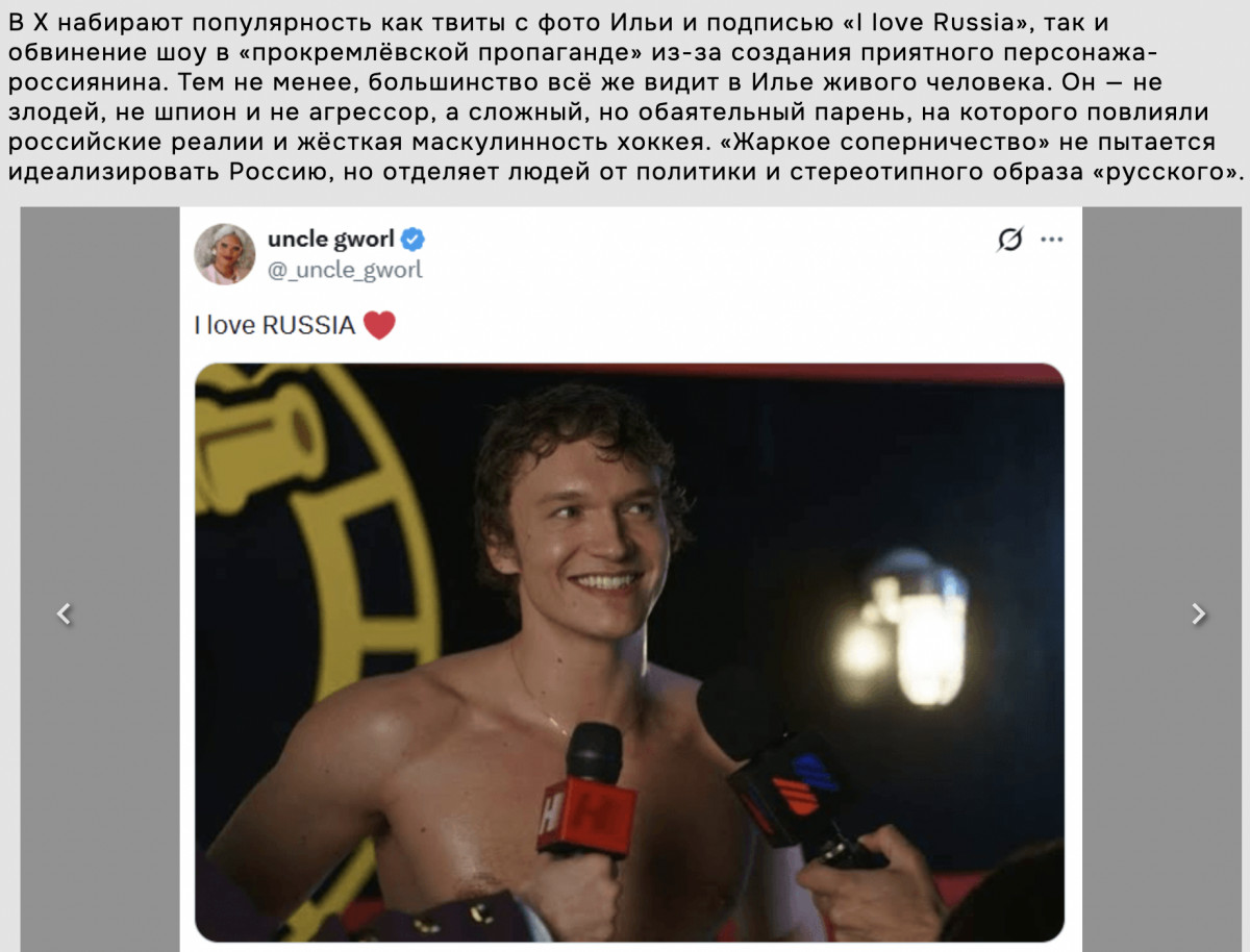 «За майже чотири роки війни та десятиліття стереотипізації в голлівудських фільмах росіяни втомилися бути лиходіями. Вони чекали на позитивну репрезентацію в медіа — і знайшли її в несподіваному місці».