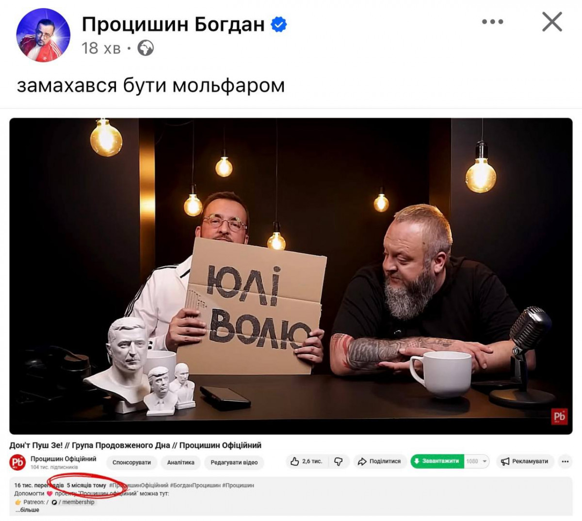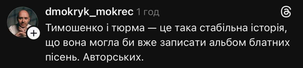 А ось Данило Мокрик гарну пропозицію придумав — я постійно звідусіль чую, як нам потрібен український блатняк. Ось вам і вихід. Треки від Тимошенко не лише будуть слухати в маршрутках, але й на музичних преміях зроблять окрему номінацію. Ще треба лиш Шуфрича на те саме підбити, аби Юлії Володимирівні було з ким конкурувати. А там і Коломойський підтягнеться.