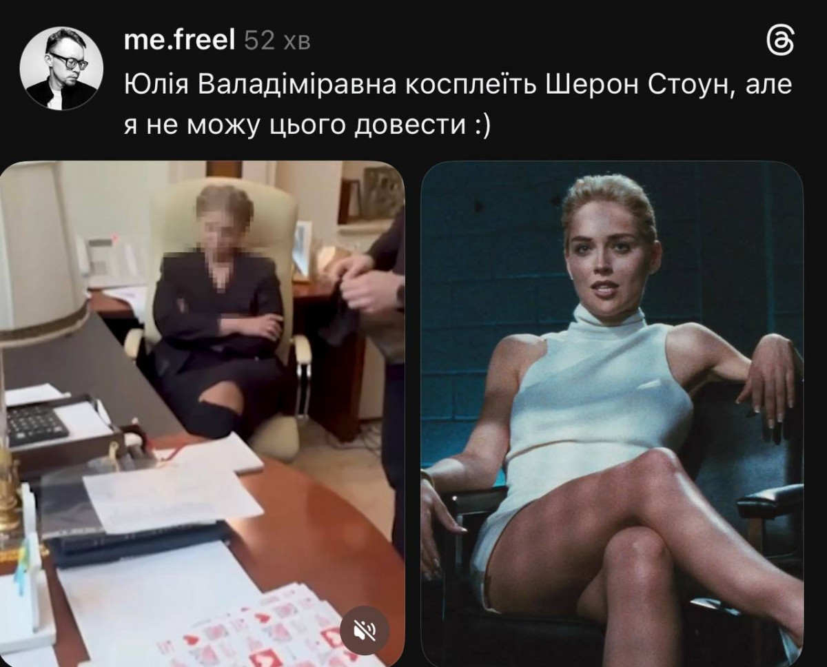 На початку одним із найпоширеніших мемів було порівняння Юлії Тимошенко з Шерон Стоун в «Основному інстинкті».