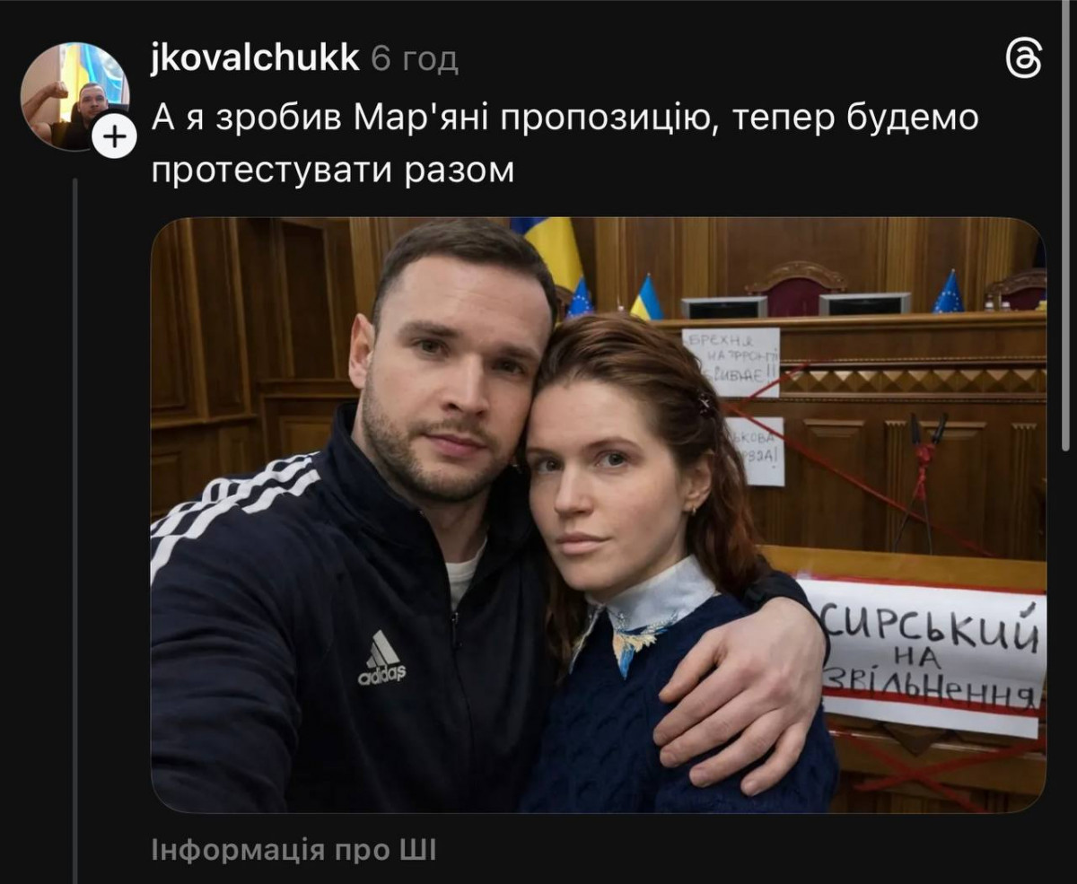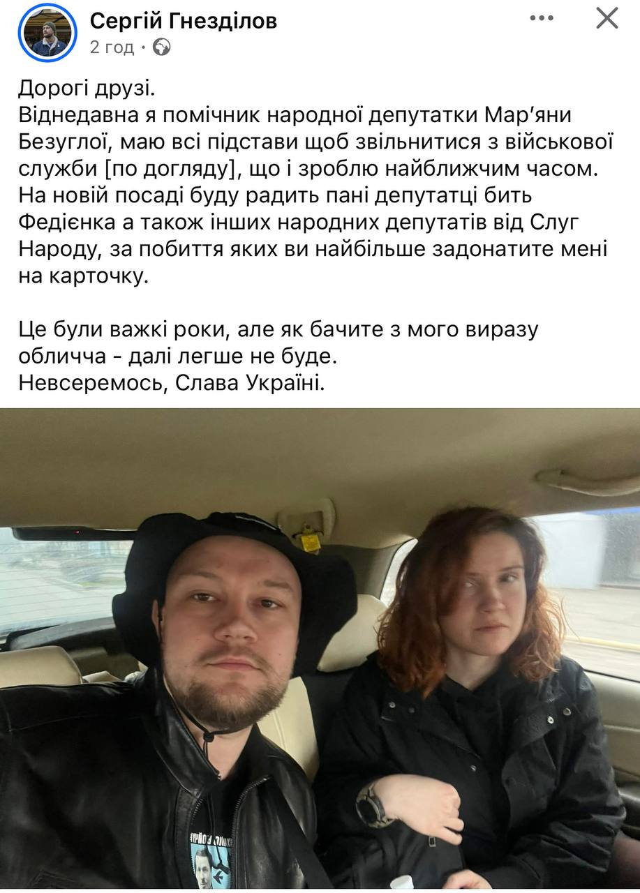 Але щодо стосунків з Мар'яною Безуглою я більше вірю військовому та засновнику «ВиделкаFest» Сергію Гнезділову. Він теж, як бачите, вдало знайшов альтернативу до публічного СЗЧ — публічну самопожертву.
