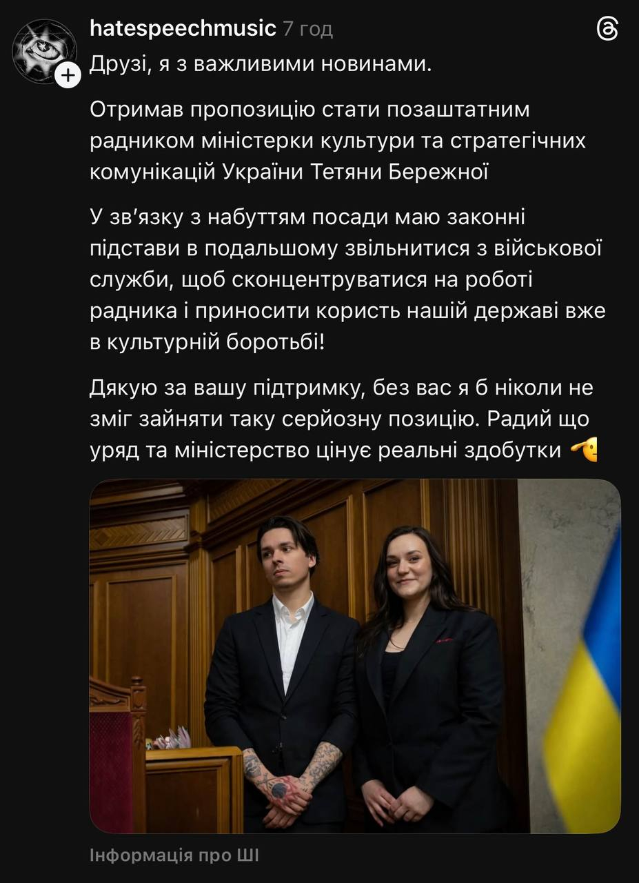 Про Мінкульт жартував і Дмитро Однороженко (гурт «Хейтспіч»). Мовляв, знайшов гарний спосіб демобілізуватися — стати позаштатним радником міністерки культури Тетяни Бережної. Щоправда, трішки спалився на назві відомства. Але тут узагалі не дивно, бо Мінкульт замість того, аби просто бути Мінкультом, у нас постійно змінює назви. То спорт приплетуть, то туризм, то інформполітику, то стратком. Але нагадаю, що нині Мінкульт, нарешті, таки прийшов до лаконічного неймінгу. Головне тепер — не чіпати.