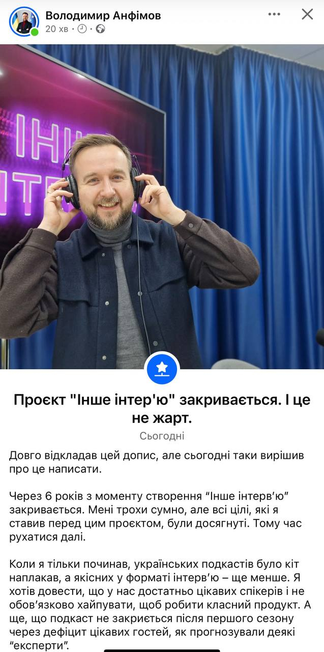 І на останок — не жарт. На жаль. Наш Колега Володимир Анфімов закриває свій подкаст «Інше інтерв'ю», який проіснував цілих 6 років. Це більше 100 епізодів.