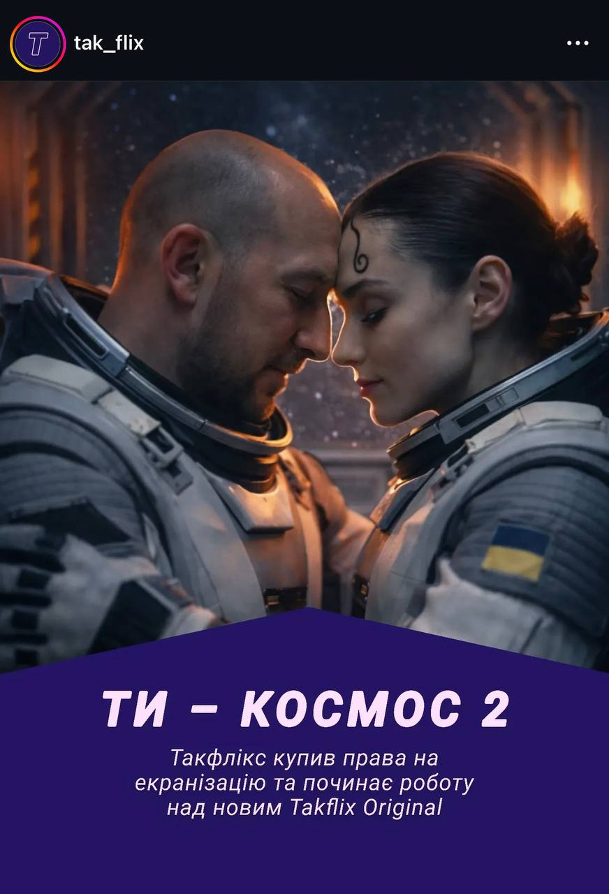 А ось так шанувальників стрічки «Ти — космос» вирішили розвести на сторіночці онлайн-кінотеатру Takflix. Стрічка стала хітом і, думаю, ви пам’ятаєте, як вона закінчилася. Тому продовження, звісно, бути не може. Але ми чекаємо на новий фільм Павла Острікова і сподіваємося, що його він не зніматиме 50 років. Очікую побачити його на тисячовесняному пітчингу.