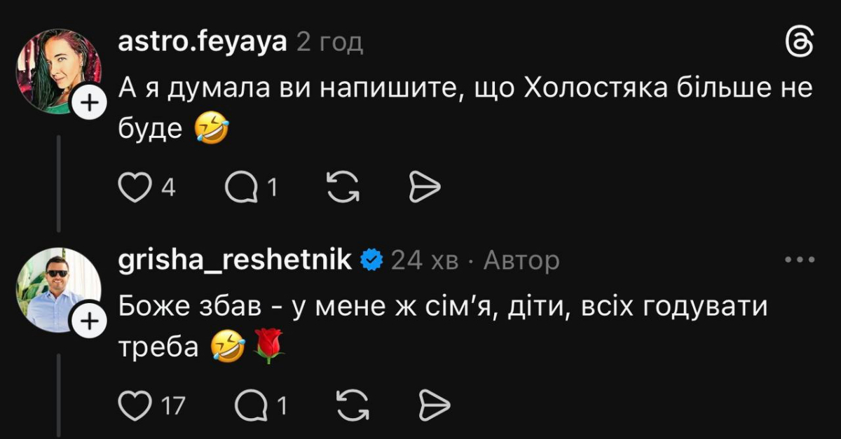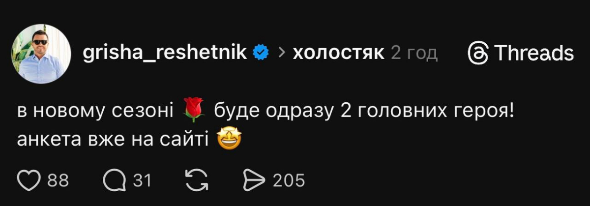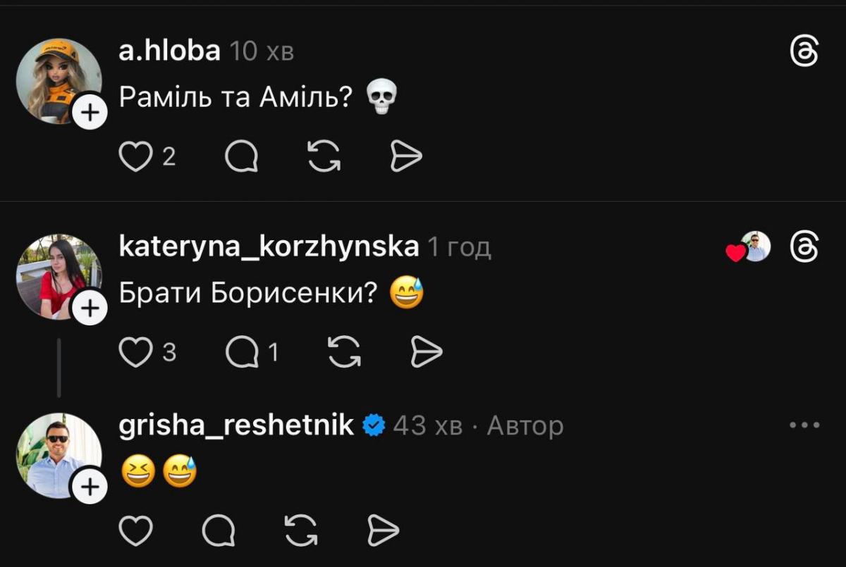 У коментарях одразу з'явилися передбачувані пропозиції на роль одразу двох Холостяків: брати Борисенки (для любителів ретро, очевидно) або брати Насірови. Правда, з Амілем таке не пройде — він пів року тому холостяком бути перестав.