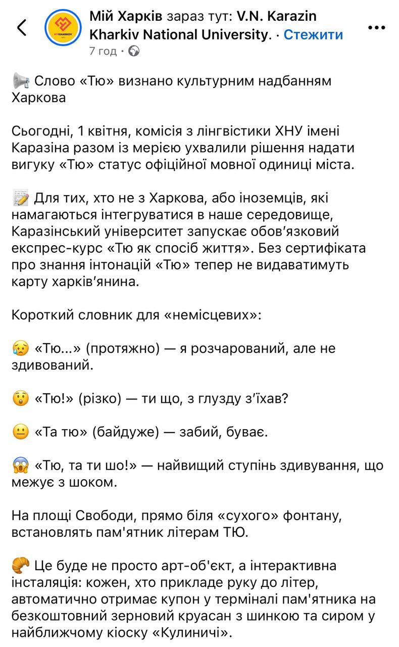 Ближче до вечора мене вже намагався розізлити харківський паблік «Мій Харків» з «новиною» про визнання слова «тю» культурним надбанням міста. Бо в мене «тю» асоціюється перш за все із Запоріжжям. Якби не 1 квітня, то заявочка потягла б на лінгвістичний махач між одразу кількома містами.