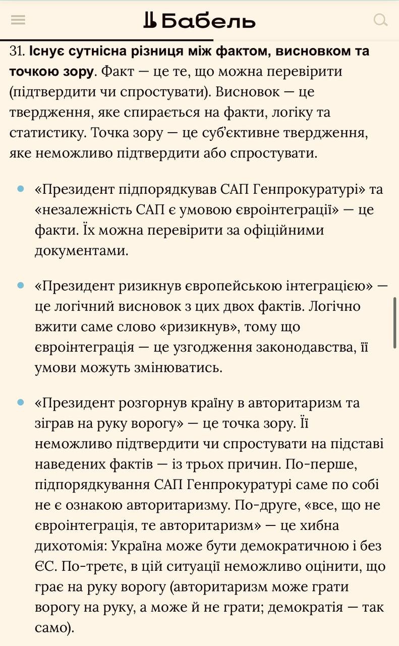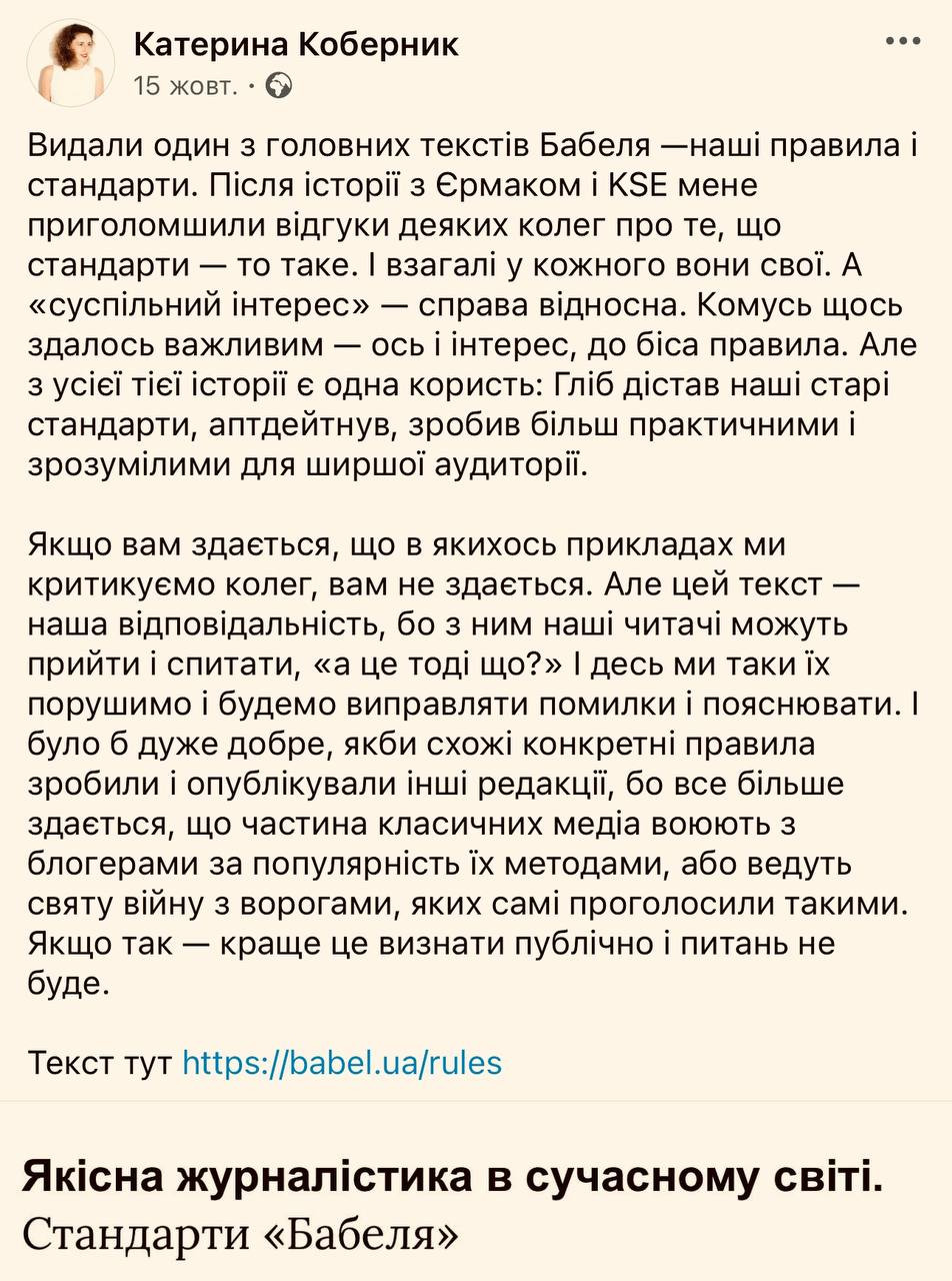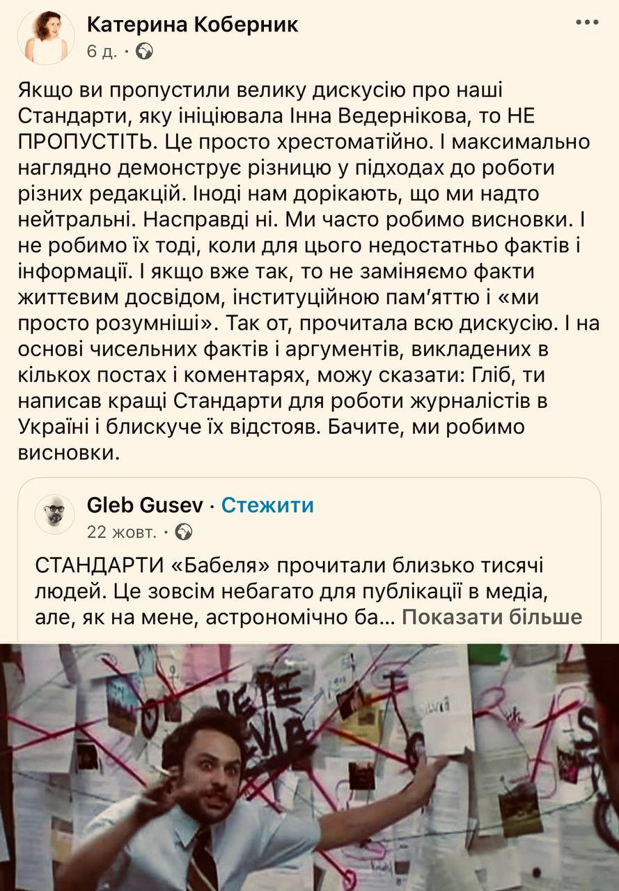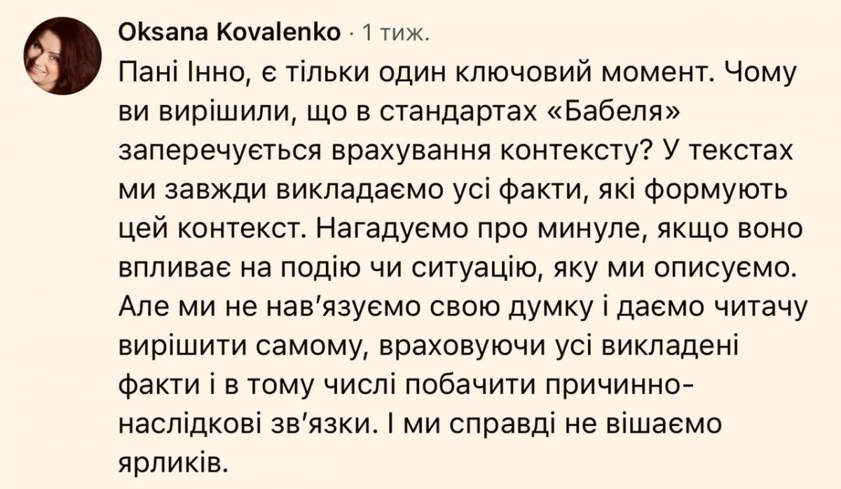 Ось навіть у цій історії натяки ми бачимо на самому початку. У коментах Катерини та Гліба до допису Інни маємо такі фрази: «Дякую, що прочитали повністю — це рідкість. Більшість дискусій закінчувались на обговоренні заголовку» та «Привіт! Схоже, це перший критичний розбір по суті». Ну а самі стандарти на сайті «Бабеля» починаються так: «Журналіст “Бабеля” служить місії видання: бути голосом здорового глузду в суспільстві, яке відчуває сильний його дефіцит».