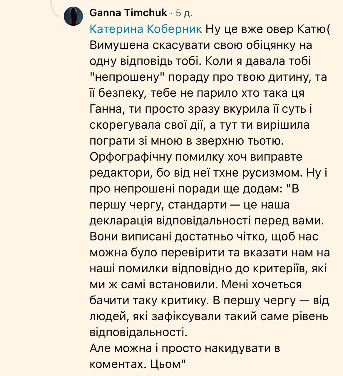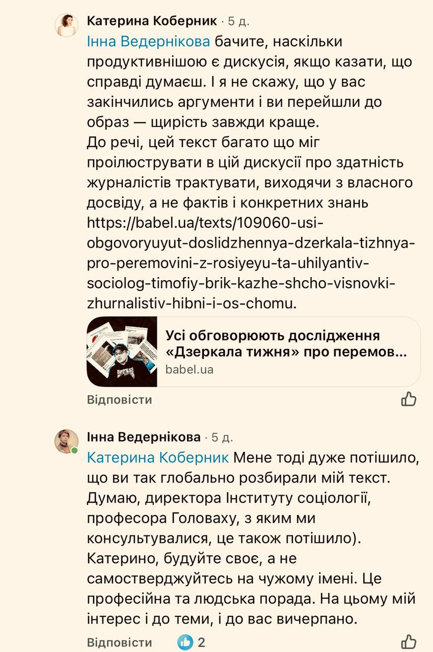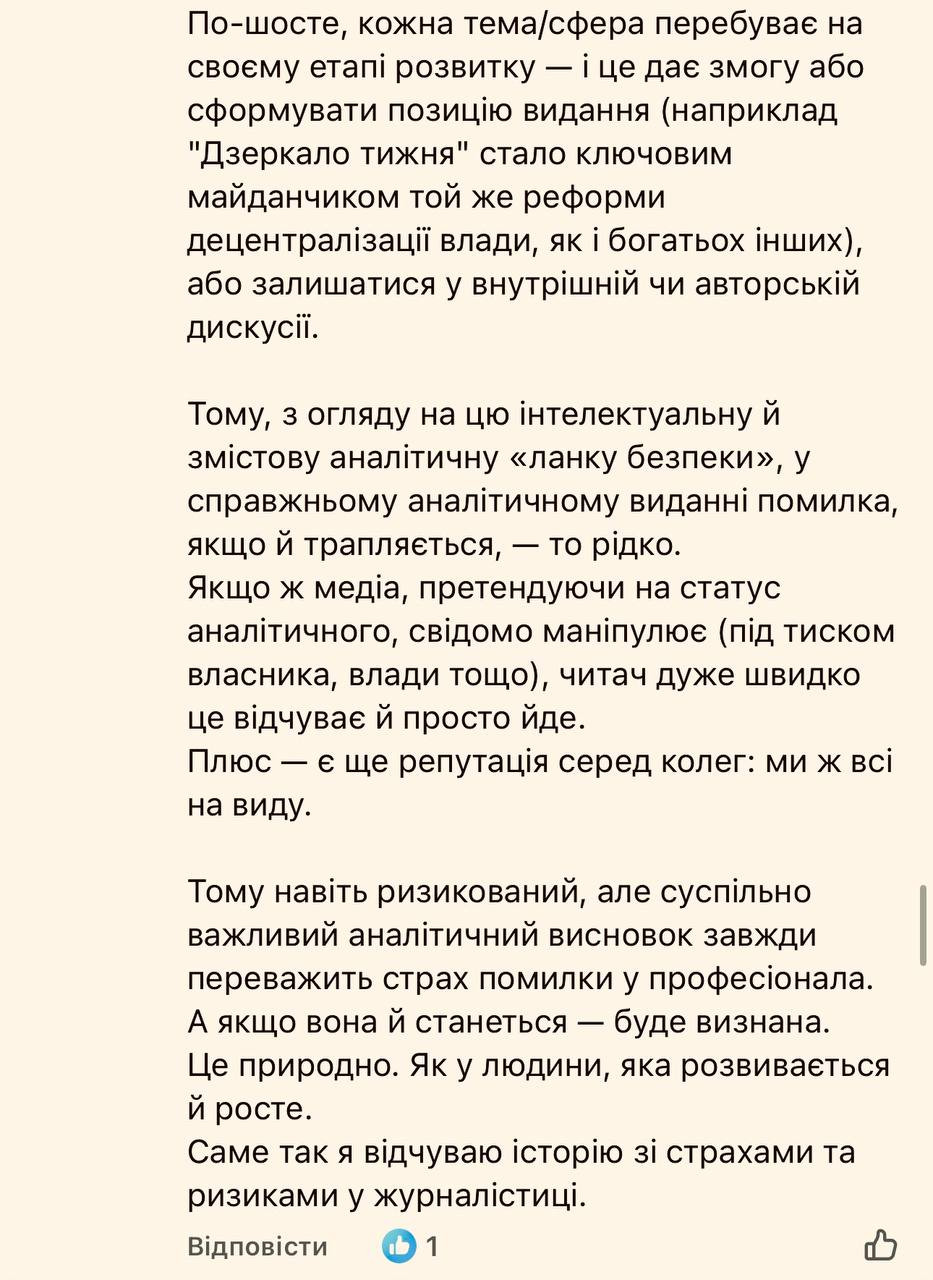Наче все норм — навіть білого пальта немає. Але допис перепостила Катерина Коберник зі своїм невеличким коментарем. І вже тут я трішки почала переживати за ексклюзивність своєї білої шуби. Та й не скажу, що дискусія ця була великою — усе ж тема виявилася досить складною (чи нецікавою) значній частині медійників.