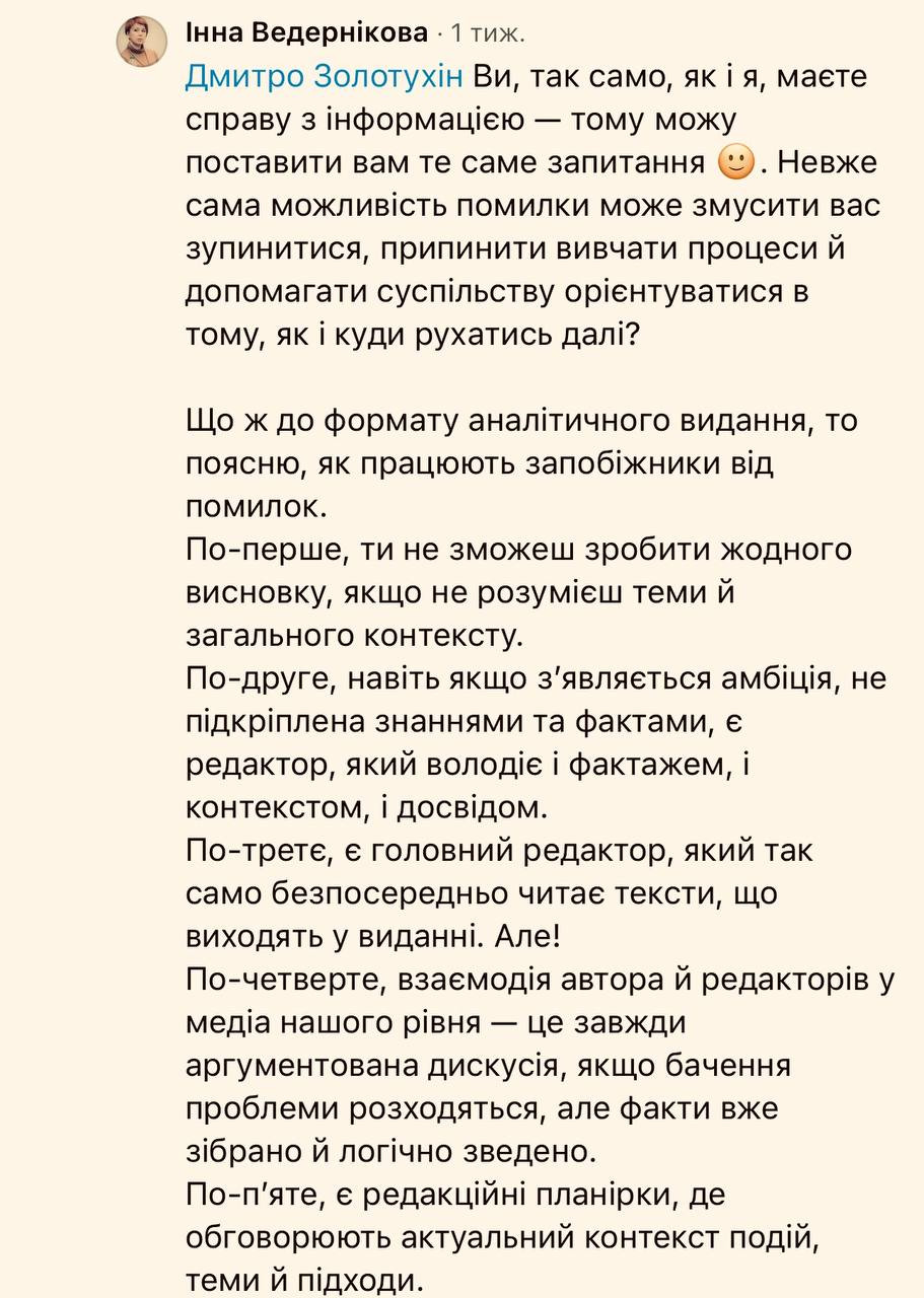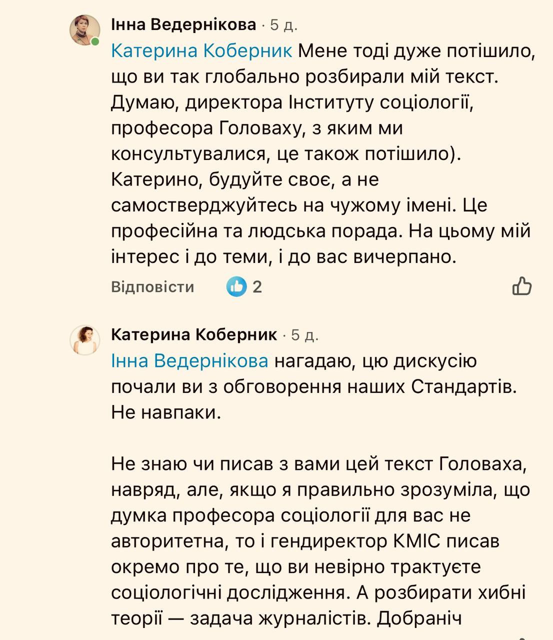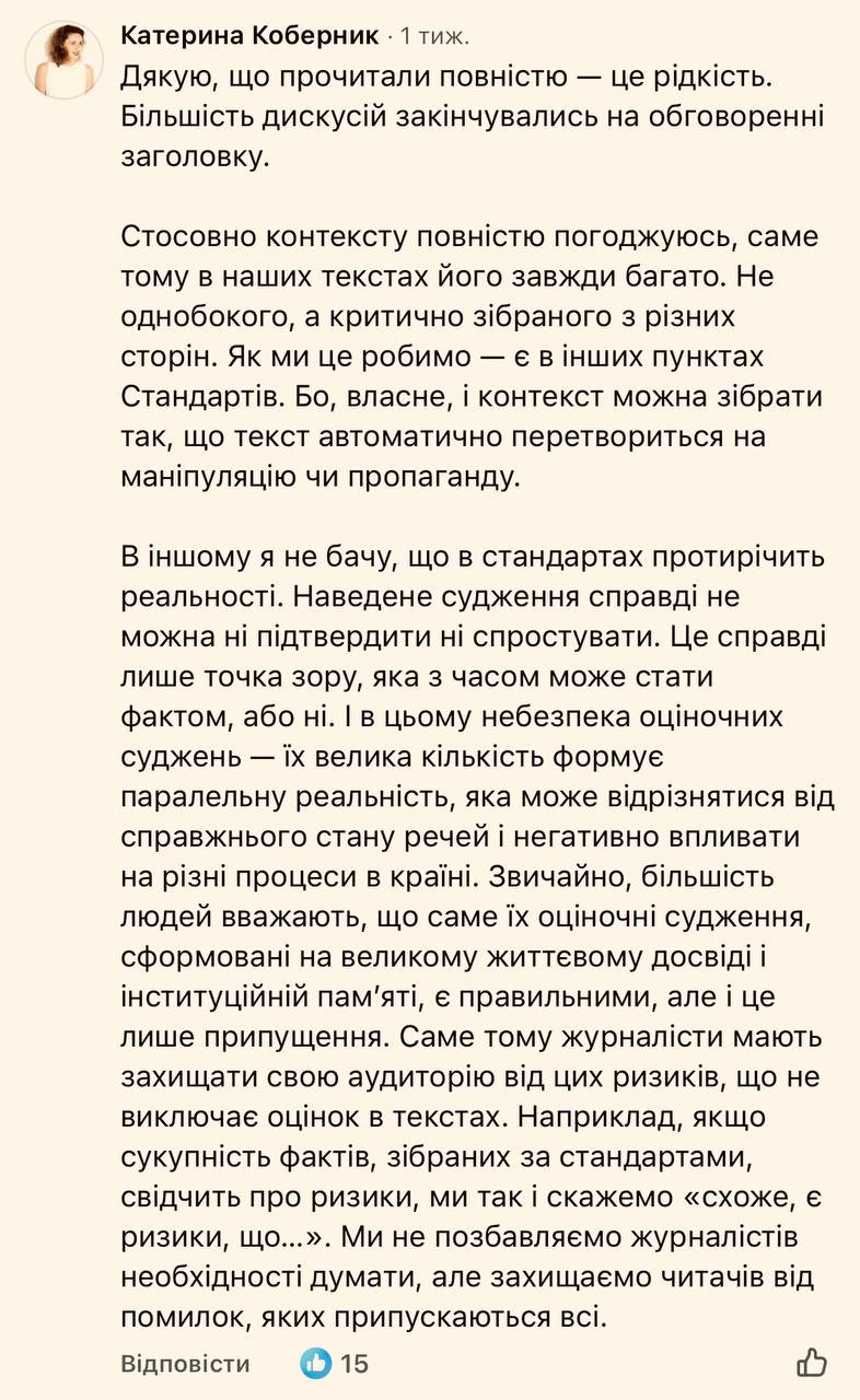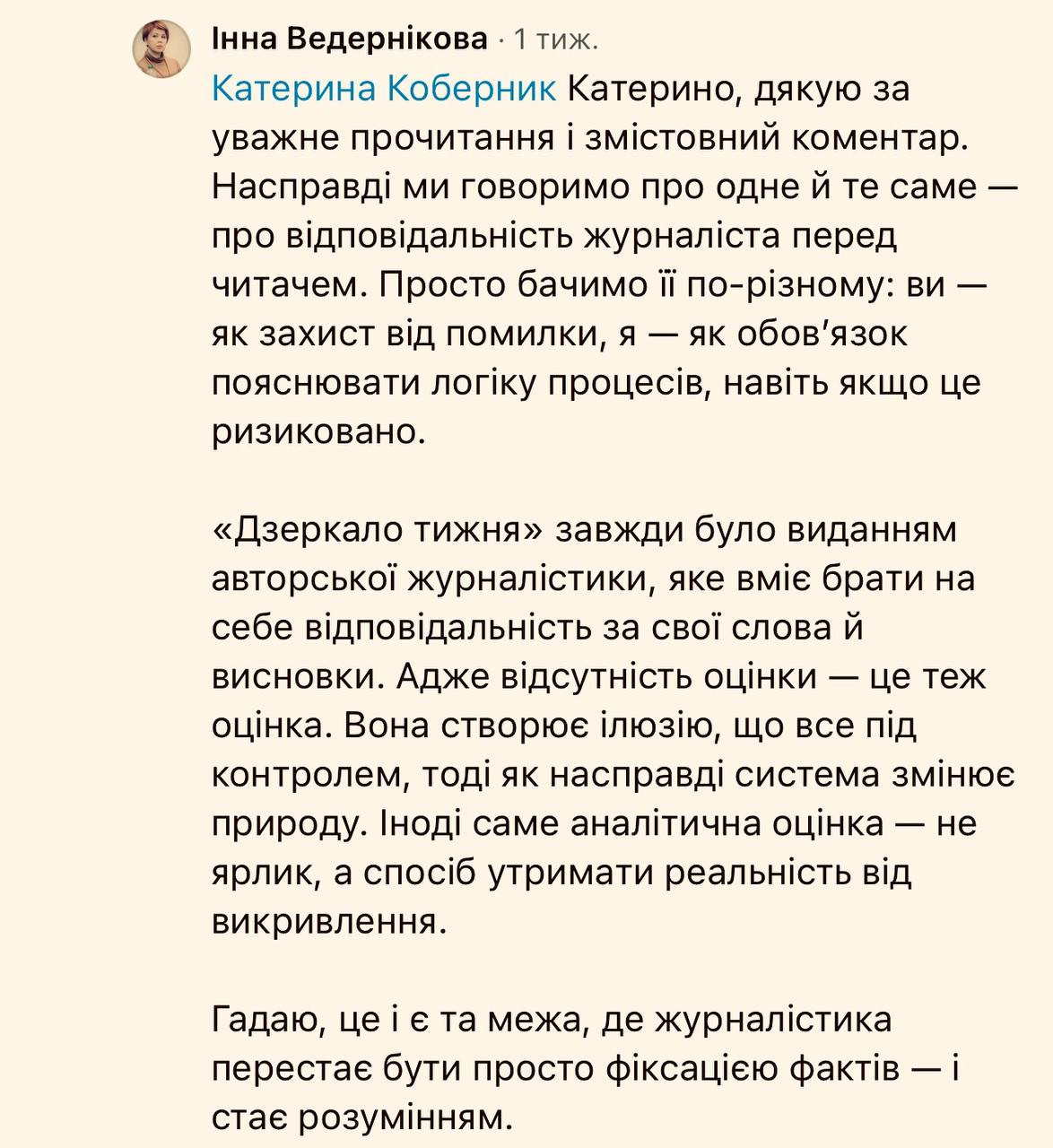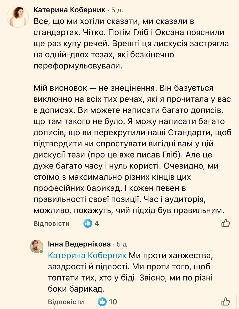 На превеликий жаль, ця дискусія виявилася доволі локальною і в неї включилося дуже мало колег. Ну а ще вона швидко зійшла нанівець. І ось чому. Інна Ведернікова написала ще один лонгрид, бо, за її ж словами, стільки тексту не помістилося в коментарі. Він важливий — почитайте. Інна детально пояснює свою позицію на прикладі історії з НАБУ і САП. Чесно кажучи, велике задоволення стежити за професійною суперечкою, в якій поважають опонента. Також Інна обіцяє, що «Дзеркало тижня» опублікує і свої стандарти.