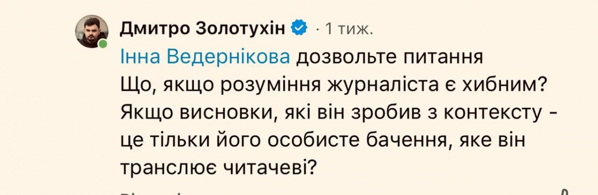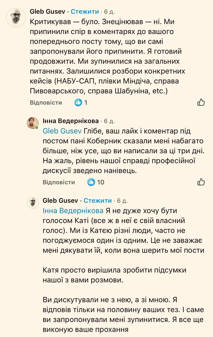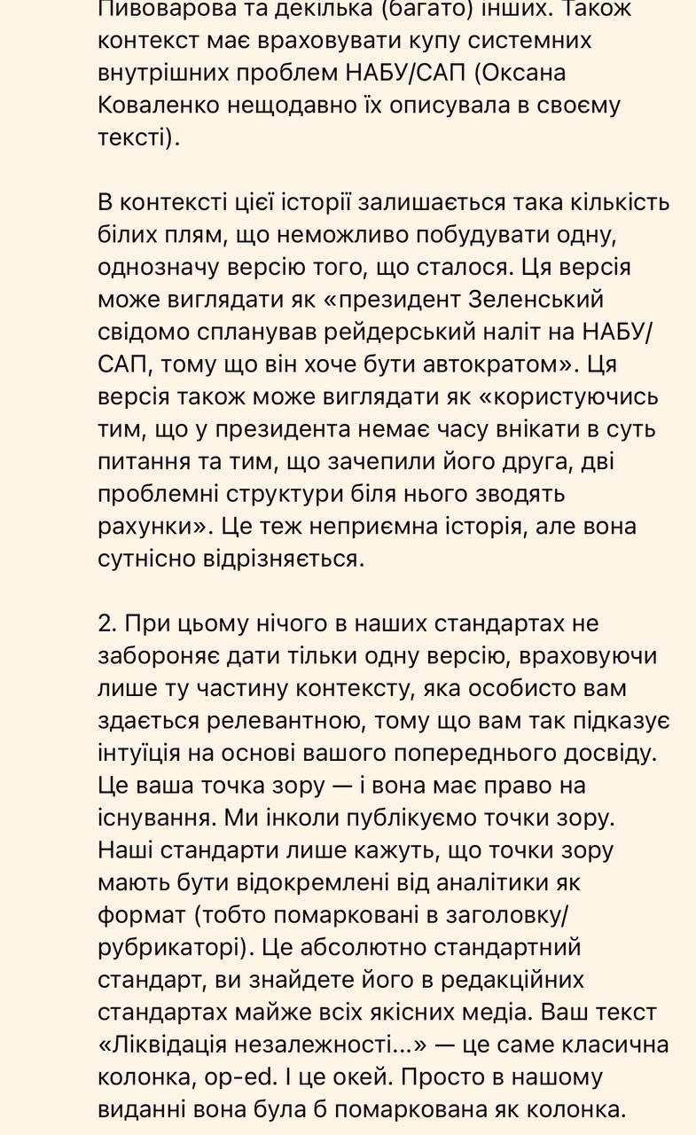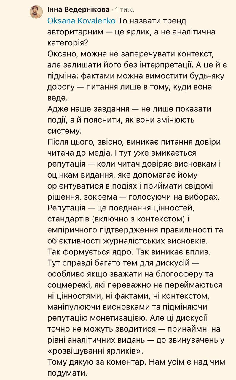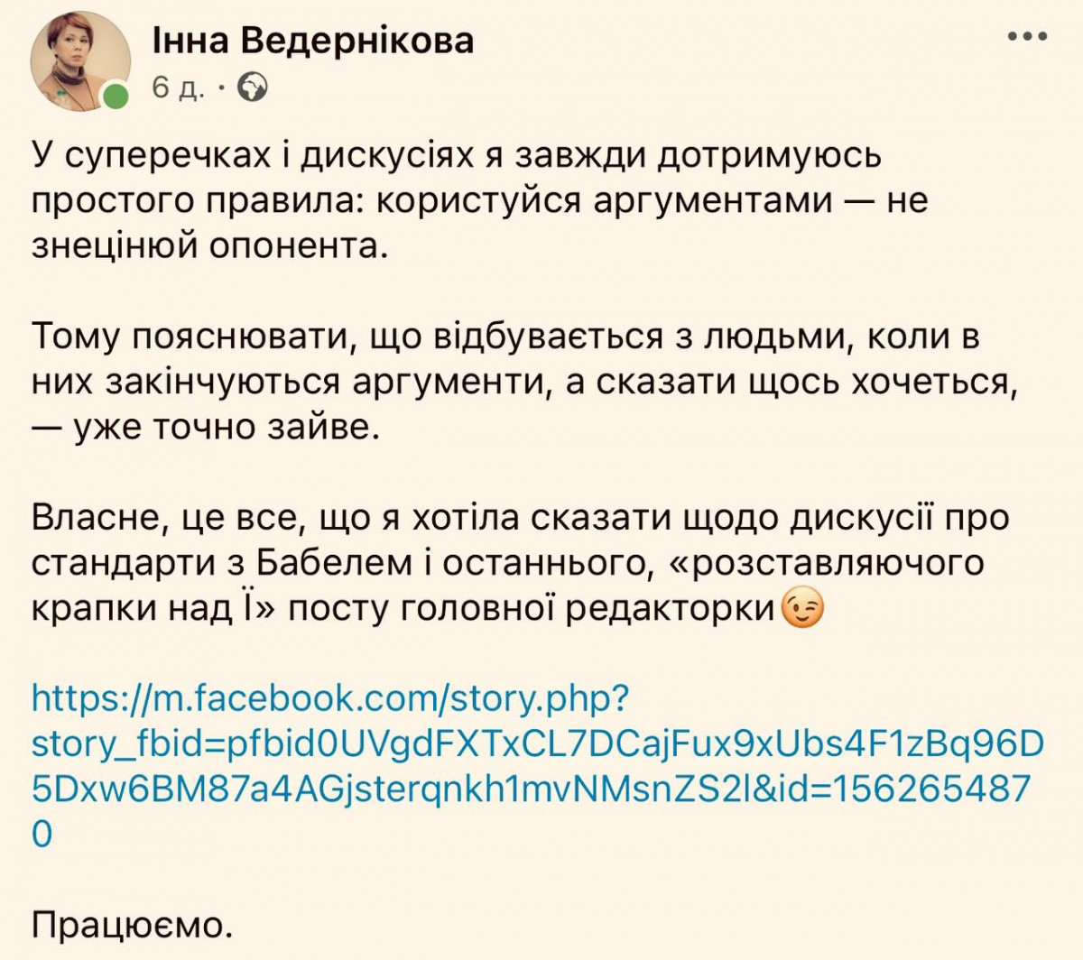 На превеликий жаль, ця дискусія виявилася доволі локальною і в неї включилося дуже мало колег. Ну а ще вона швидко зійшла нанівець. І ось чому. Інна Ведернікова написала ще один лонгрид, бо, за її ж словами, стільки тексту не помістилося в коментарі. Він важливий — почитайте. Інна детально пояснює свою позицію на прикладі історії з НАБУ і САП. Чесно кажучи, велике задоволення стежити за професійною суперечкою, в якій поважають опонента. Також Інна обіцяє, що «Дзеркало тижня» опублікує і свої стандарти.