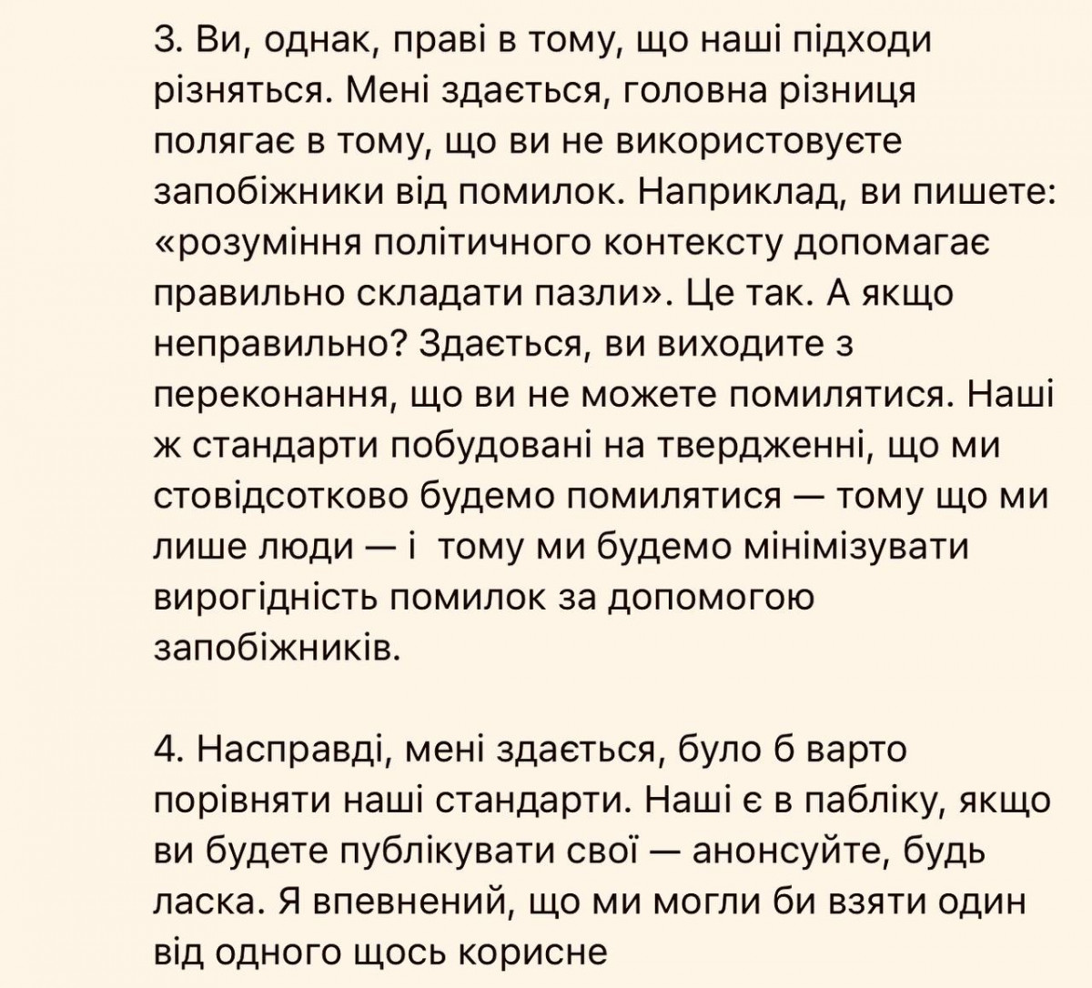 А ось шефредакторка «Детектора медіа» Наталія Лигачова, коли вичитувала цей текст, то сказала вам усім передати і її думку: «Стандарти “Бабеля” — в цілому ок, але сформульовані навіщось на дуже чутливих прикладах та зчитуваній адресній критиці підходів окремого видання. А не на нейтральних прикладах, далеких від сьогодення, що було б доречніше як для документа. А далі вже поганий присмак від подальшого явного вивищування власного видання над іншими. От цього не треба було б робити».