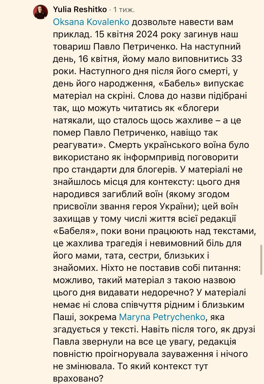 Я чекала, коли це станеться, і це сталося — «Бабелю» нагадали їхній матеріал з назвою «Блогери в X дві години натякали, що на фронті сталося щось жахливе. Виявилося, мова про загибель бійця Петриченка. Що це було — людські емоції чи накрут?». Він викликав цілу бурю в тому ж іксі: «Бабель» розкритикували так, що аж писали про категоричну відмову давати їм коментарі в майбутньому. Нагадайте собі цю історію ось тут. Редакція видання тоді з критикою категорично не погодилася.
