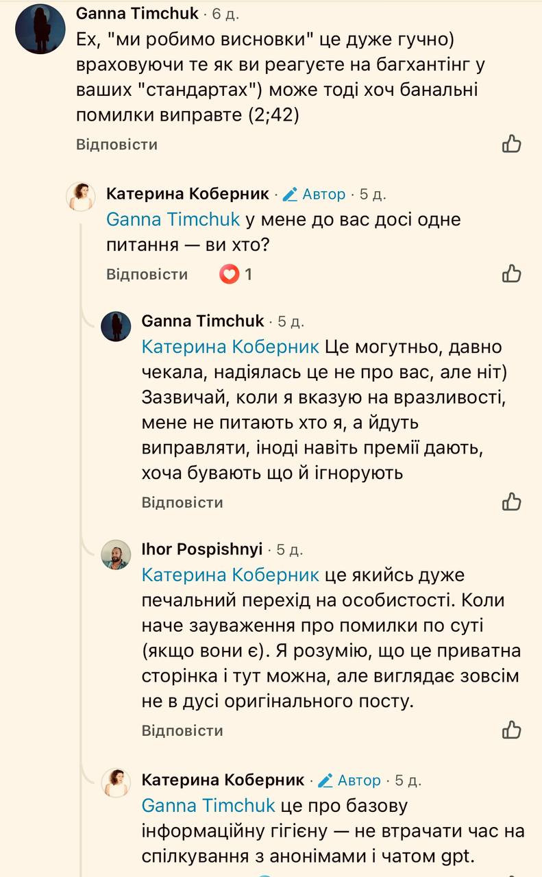 Але ж нам було сказано, що стандарти пишуться зокрема для того, аби читачі «Бабеля» мали змогу вказувати редакції на помилки. Та, виявляється, це не має жодного сенсу, якщо у відповідь читачам казатимуть: «А ви хто взагалі такі? Ми з ШІ не спілкуємося». Звісно, можна не погодитися із зауваженням, але ж не хамити.