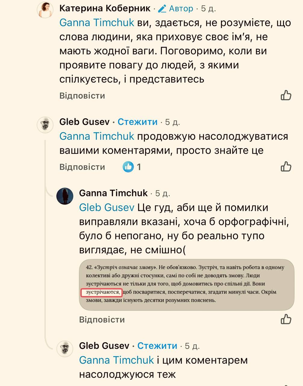 Там з Глібом сперечаються, але це ви вже самі подивіться. Загалом, як мені здається, саме тут і Гліб, і Катерина відповідають доволі френдлі та аргументовано. Також свою думку щодо розуміння контексту написала політична журналістка «Бабеля» Оксана Коваленко.