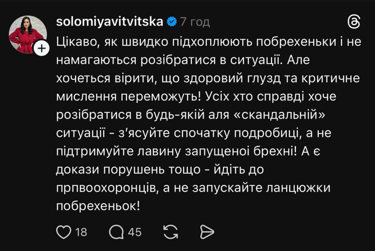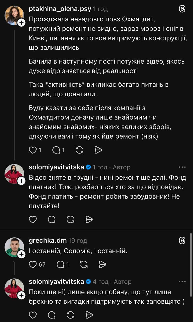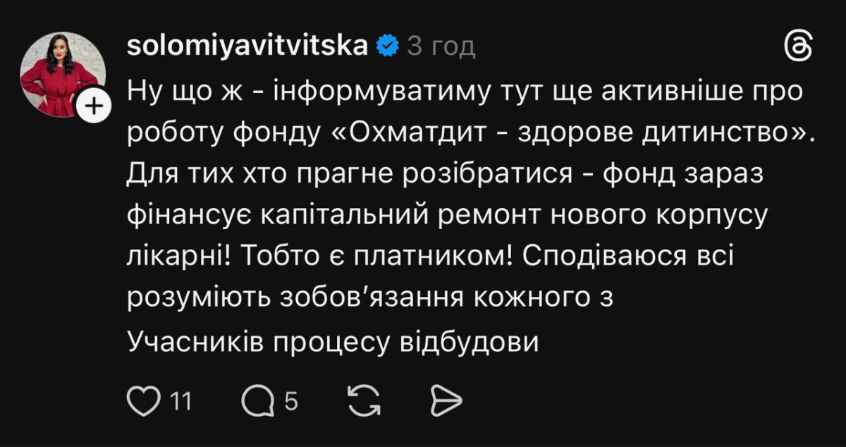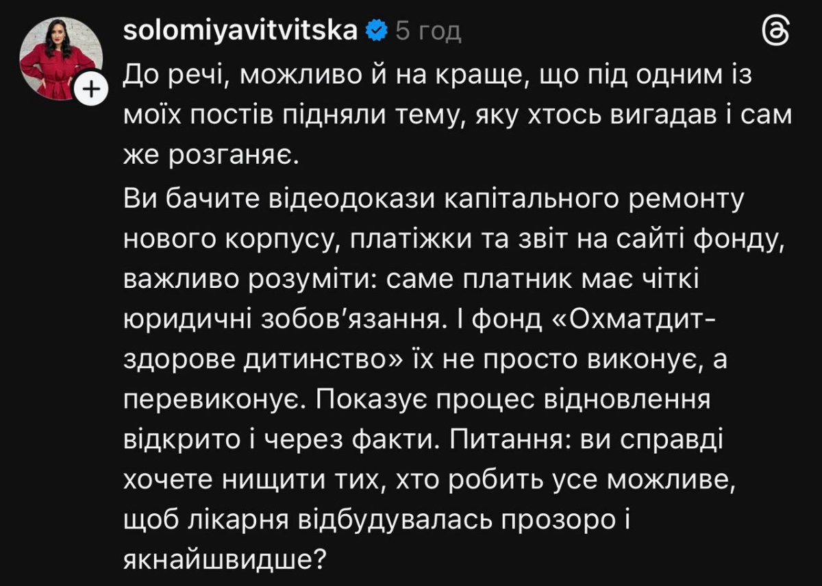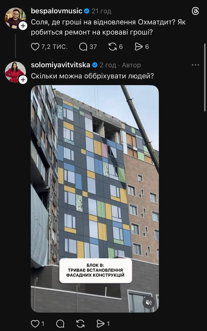 Як Соломія Вітвіцька невдало зайшла в тредс і знову вихопила за скандальну відбудову «Охматдиту»