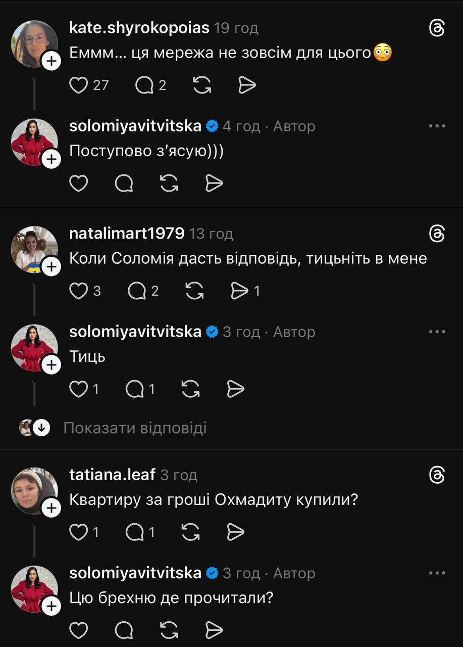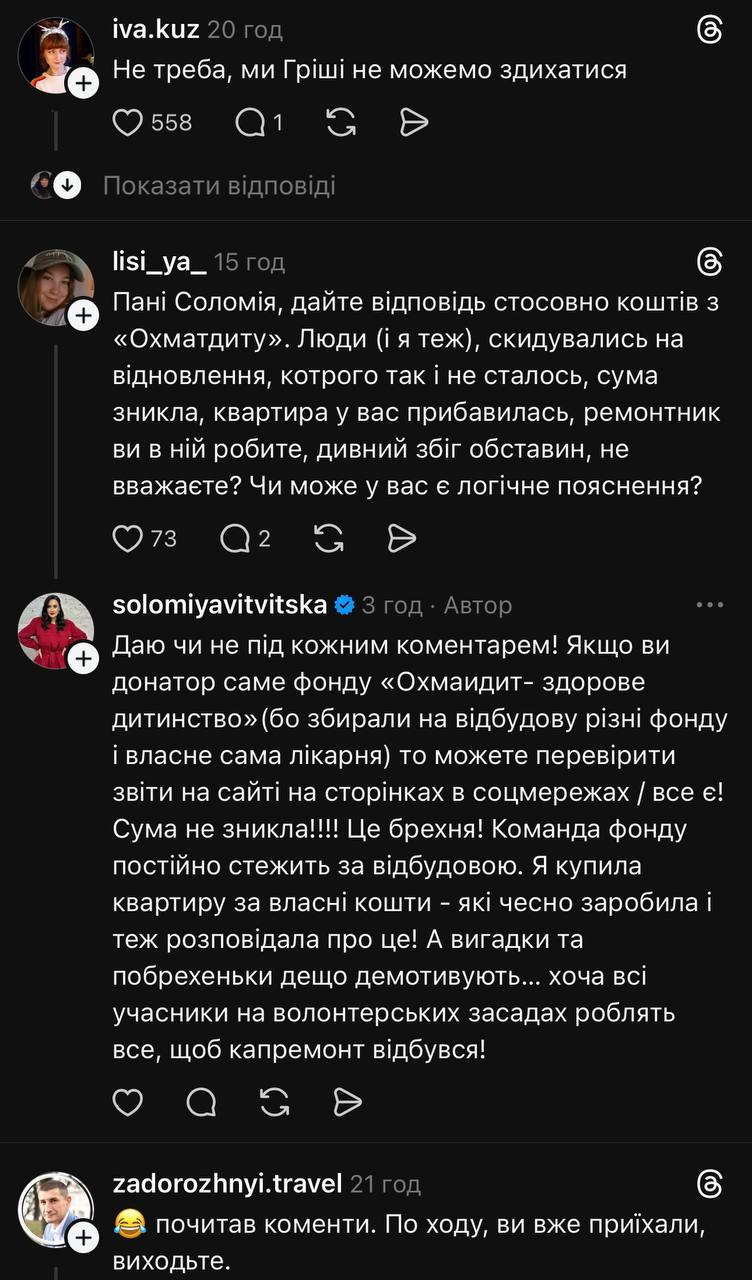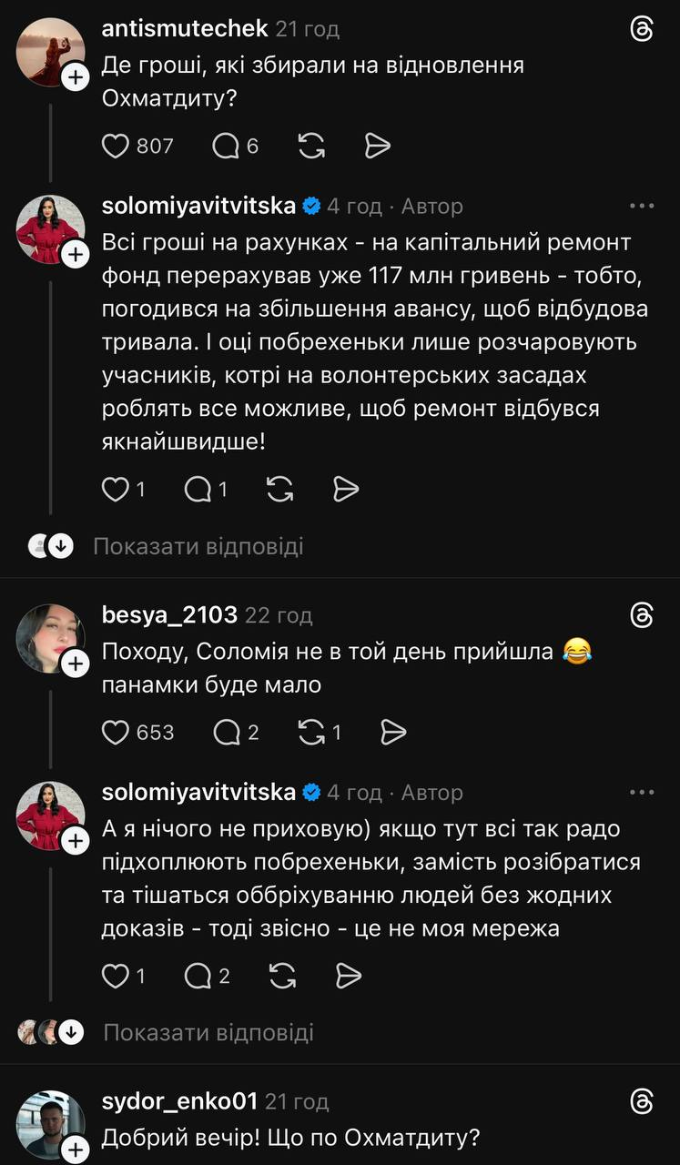 Але старт виявився фатальним, адже це тредс. Як то кажуть у фейсбуках, «а її навіть ніхто не привітав». Соцмережа миттєво зустріла Соломію міцними обіймами народної ворожості та гніву. Ваша Антоніна взялася гортати коментарі з надією побачити бодай один позитивний, але довелося продиратися крізь лавину запитань про гроші на відновлення «Охматдиту». Соломія намагалася відповідати на майже всі, але, але...