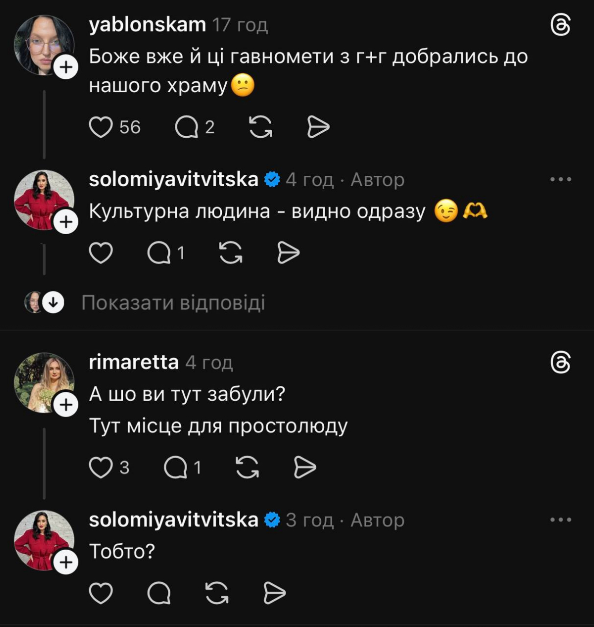 Ваша Антоніна читала відповіді Соломії та й думала: на «Плюсах» піарників позвільняли чи що? Зазвичай ось так відбиваюся люди в паніці та істериці, у яких немає доступу до промовідділів. Далі ведуча вирішила, що відповідати на коменти — замало, і винесла їхній зміст в окремий допис.