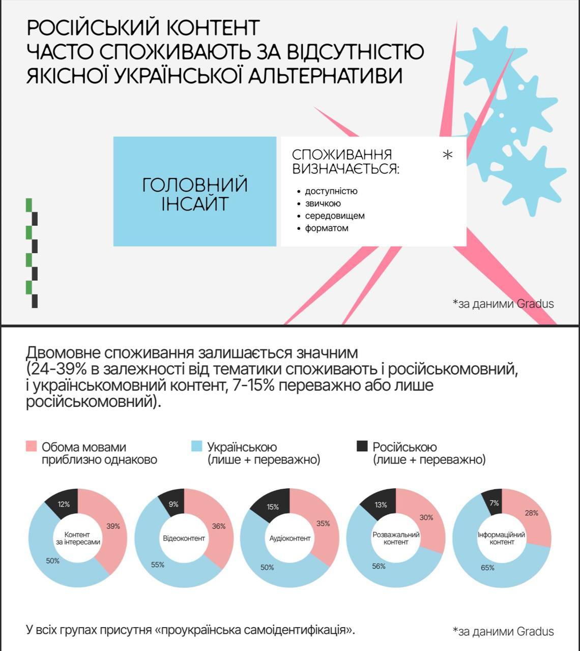 Один з основних — це купа грошей. Так, купа грошей. Їх реально дуже багато на один раз, спільнота після 2022-го дуже зменшилася, є шанс просто не вивезти таку кількість контенту. В сенсі, не вивезти зробити його якісно. А саме на якості наголошує Тетяна Бережна. Усі ці твори повинні стати суттєвою альтернативою російському контенту, який українці все ще активно дивляться. Про що свідчить опитування від Gradus, яке провели на замовлення Мінкульту, аби зрозуміти потреби українців.