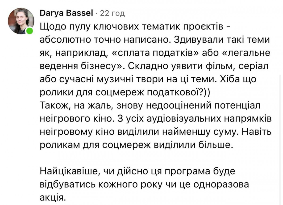 Ось, приміром, продюсерка Дар'я Бассель пише, зокрема, про знову обділену документалістику: